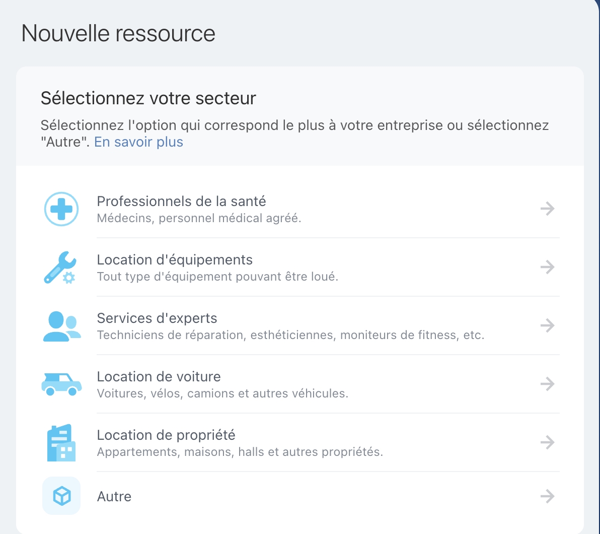 Accédez à la section Réservation en ligne, cliquez sur Ajouter une ressource, puis sélectionnez le domaine d’activité de votre entreprise. Cela adaptera automatiquement les paramètres de la ressource, en proposant le type et les modèles de messages appropriés, comme ceux pour la réservation de spécialistes ou d’équipements.