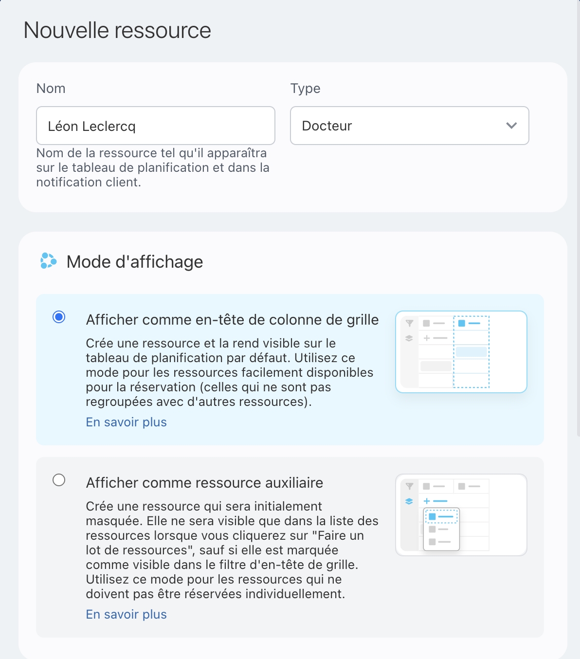 Afficher comme en-tête de colonne de grille : Convient pour les ressources principales. La ressource apparaîtra toujours comme une colonne distincte sur le tableau de planification.