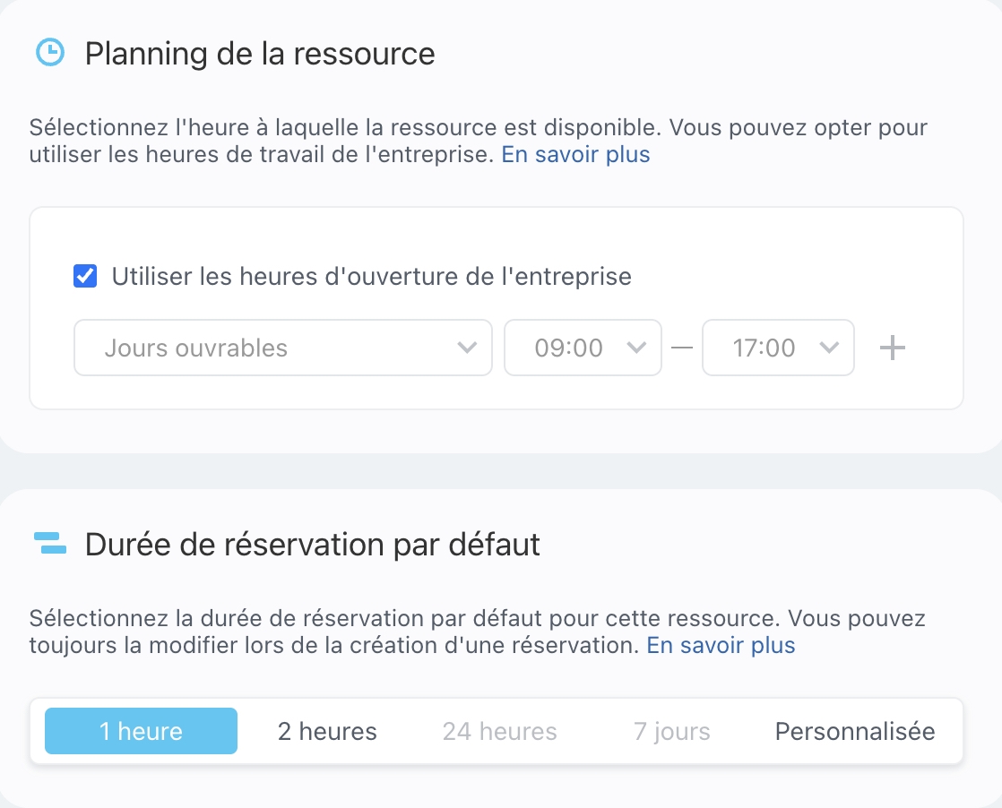 Configurez les horaires de travail et précisez quand la ressource sera disponible pour la réservation. Appliquez les horaires d’ouverture de votre entreprise ou définissez un planning individuel. Ces paramètres vous permettent de définir de manière flexible la disponibilité pour chaque jour de la semaine.