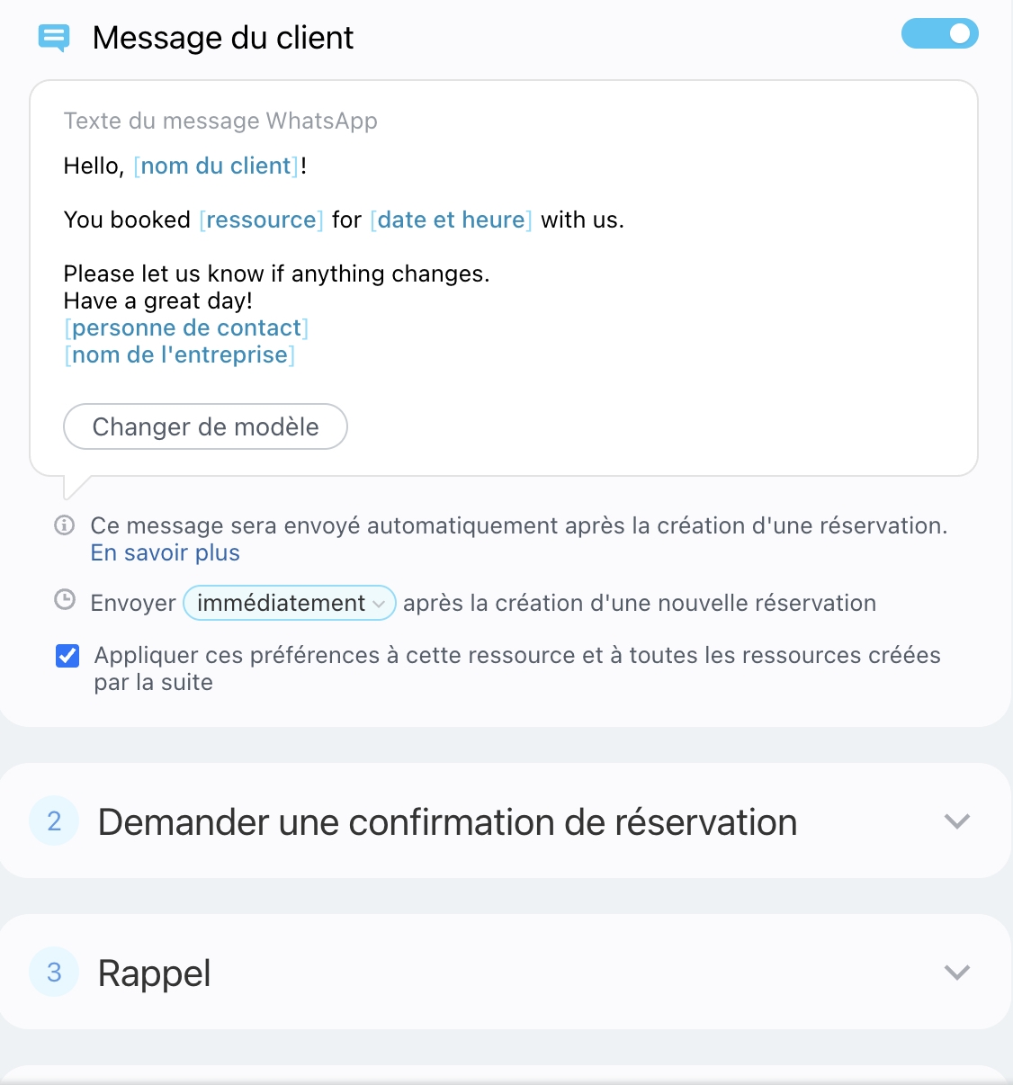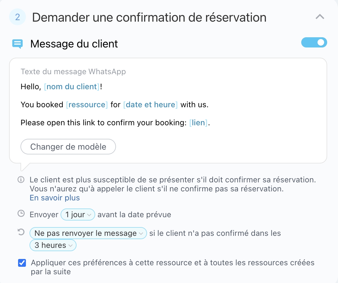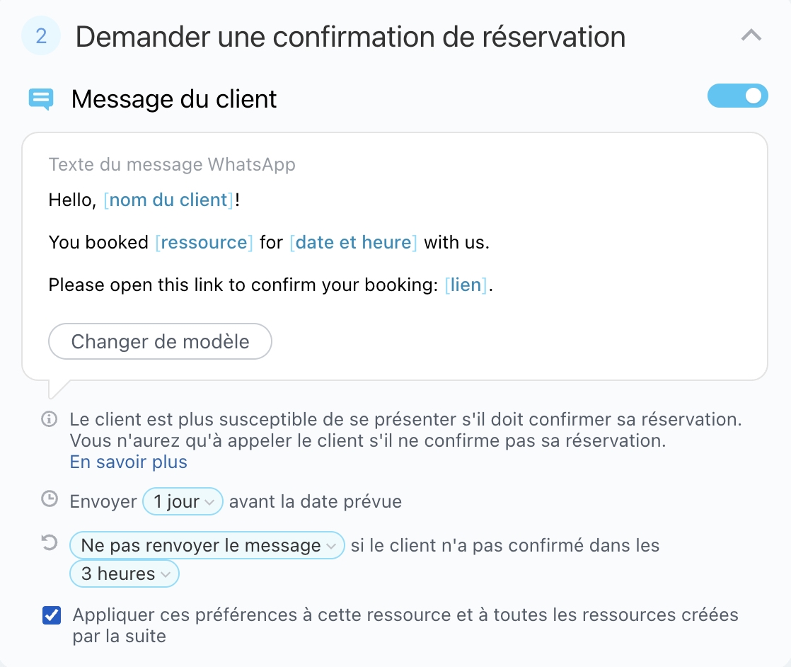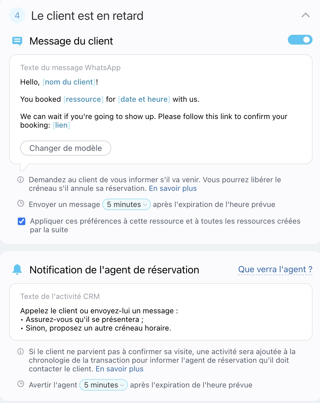 Dans les messages « Demander une confirmation de réservation » et « Le client est en retard », vous pouvez configurer des notifications pour que les agents soient informés si le client n’a pas confirmé la réservation ou s’il est en retard.