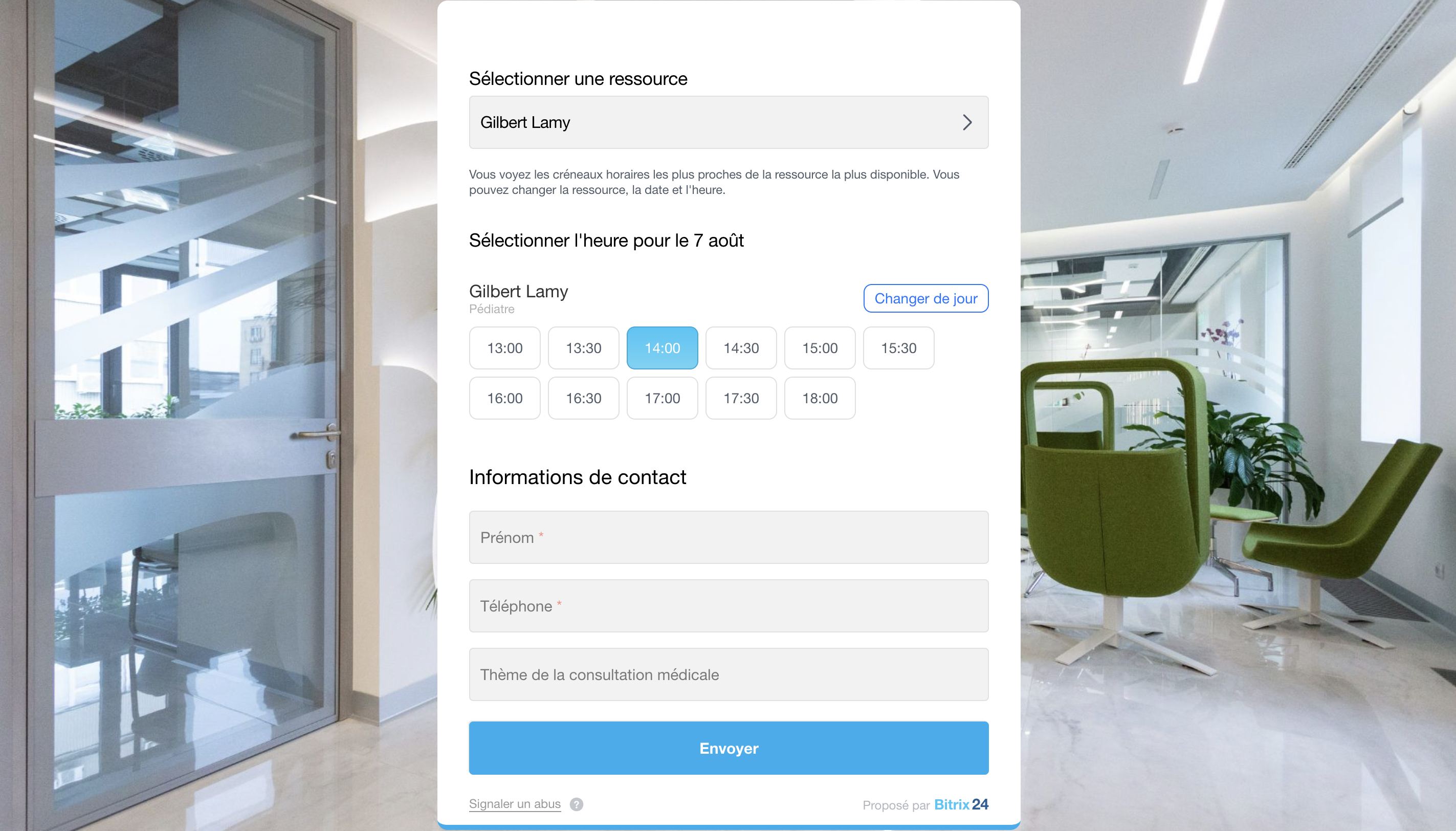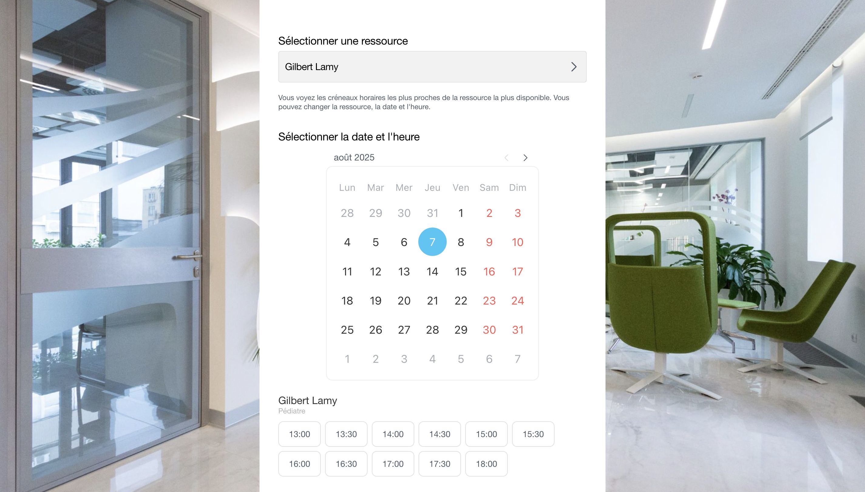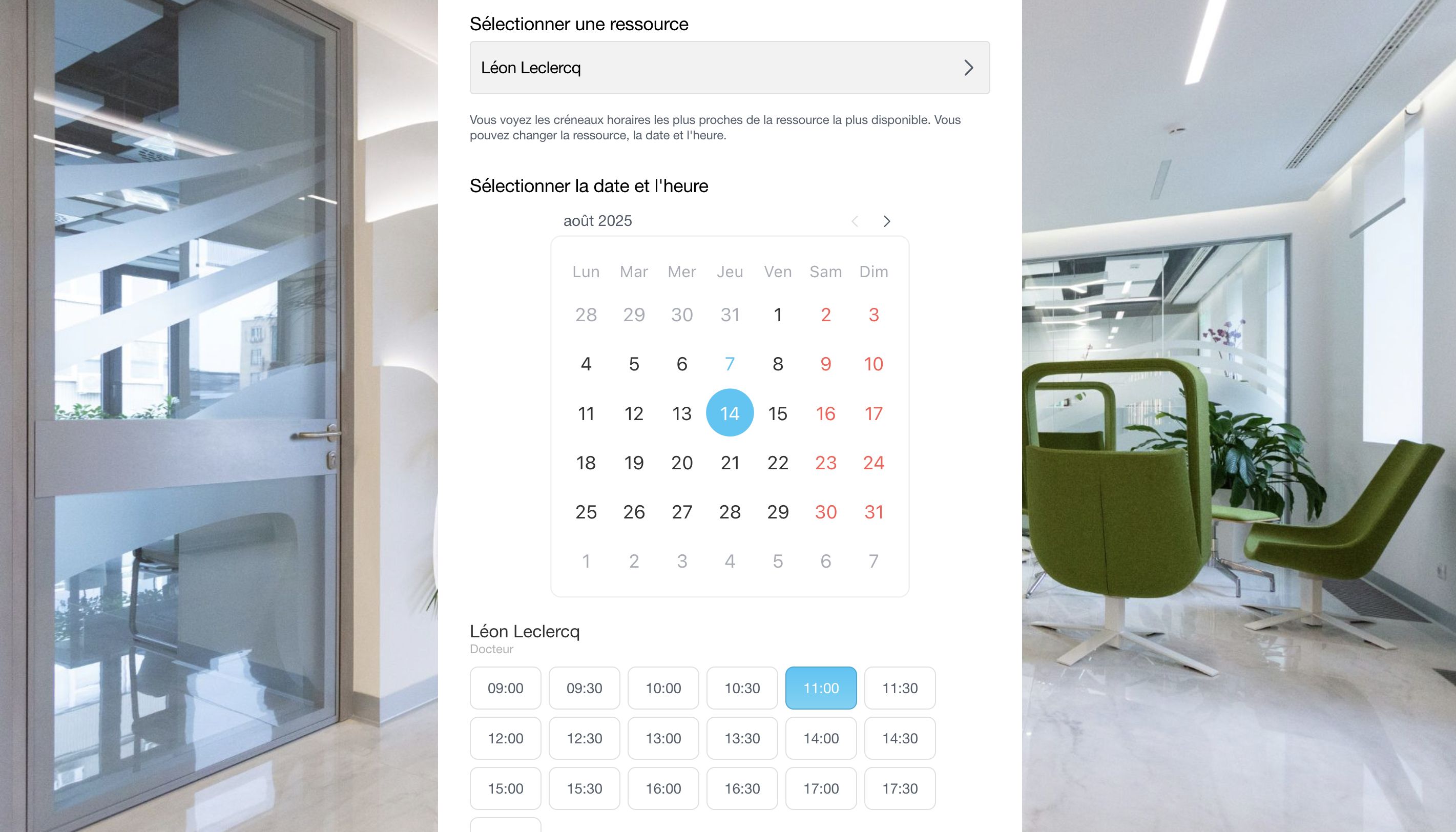 Les clients peuvent sélectionner indépendamment la ressource, la date et l’heure. C'est idéal lorsqu'il est important de réserver non seulement un créneau horaire, mais également un spécialiste ou un équipement spécifique.