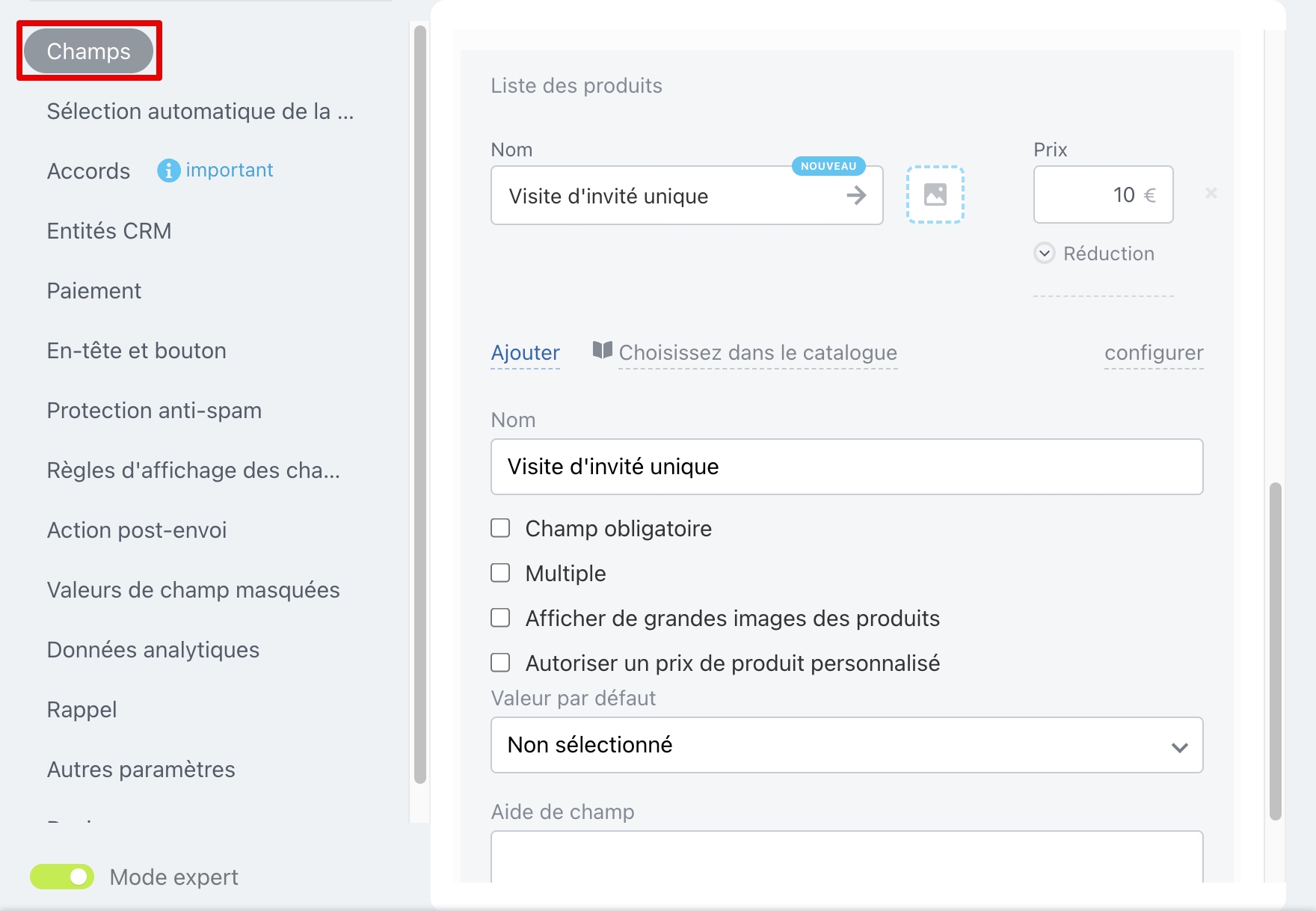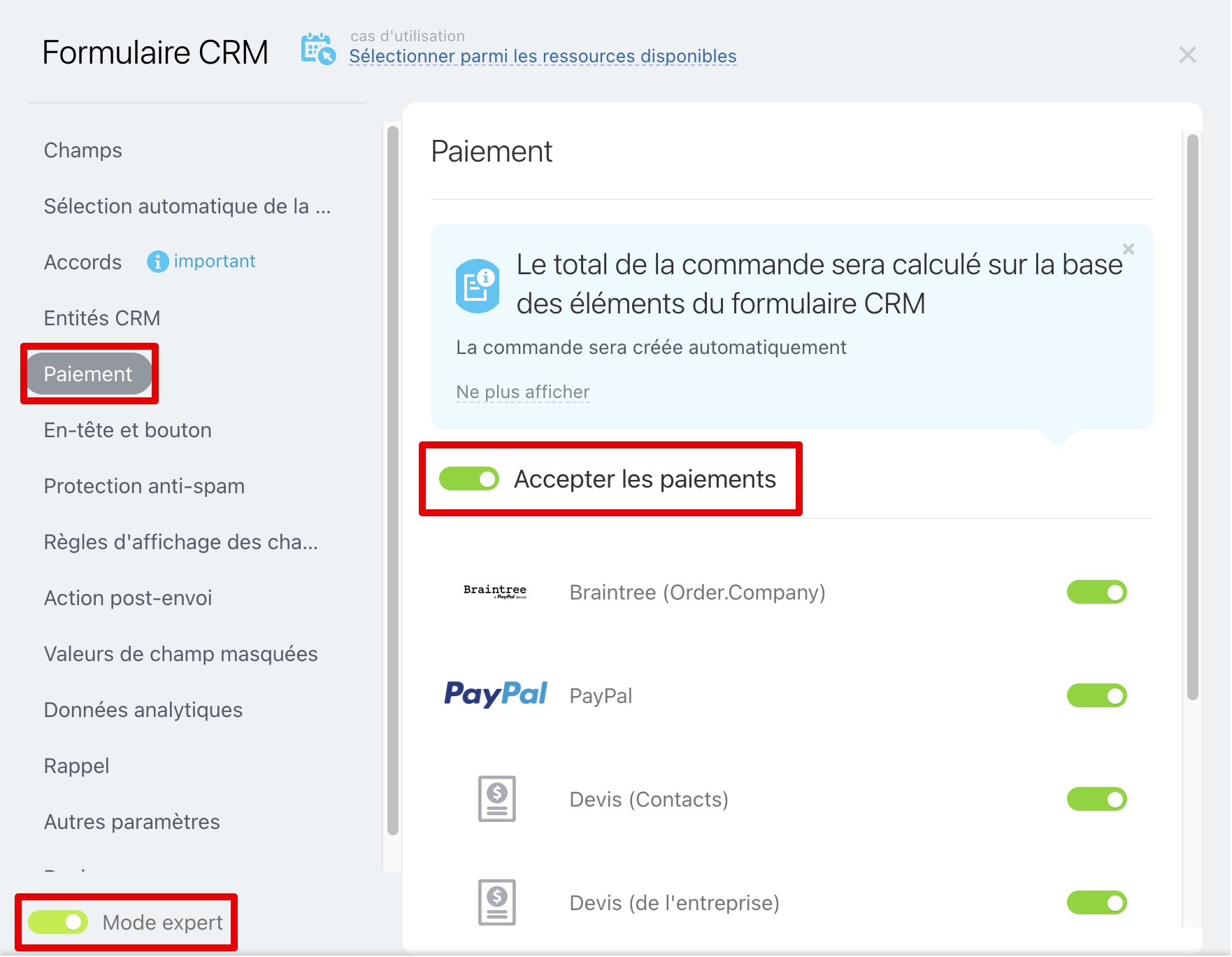 Pour activer les paiements, activez simplement « Mode expert » dans les paramètres du formulaire.