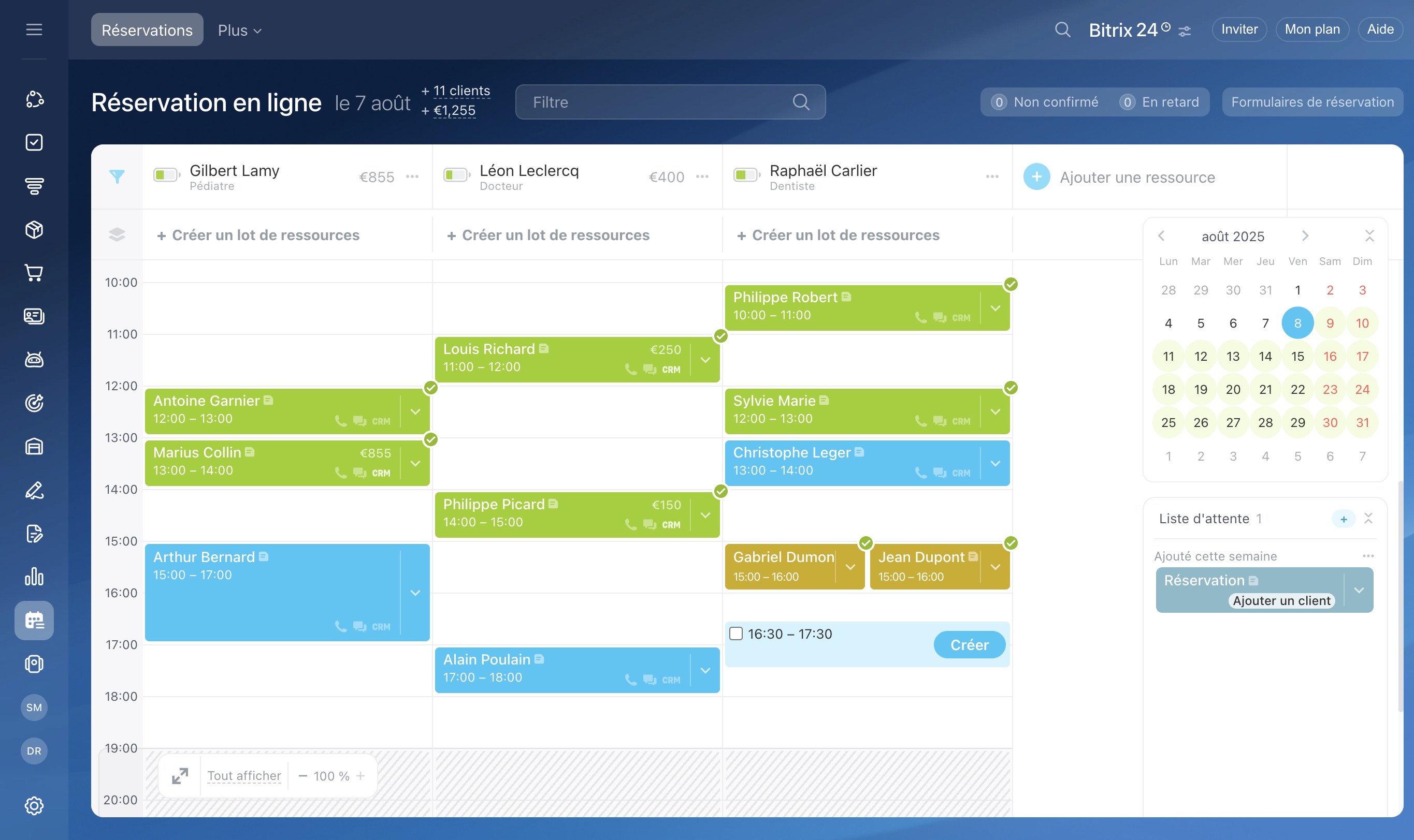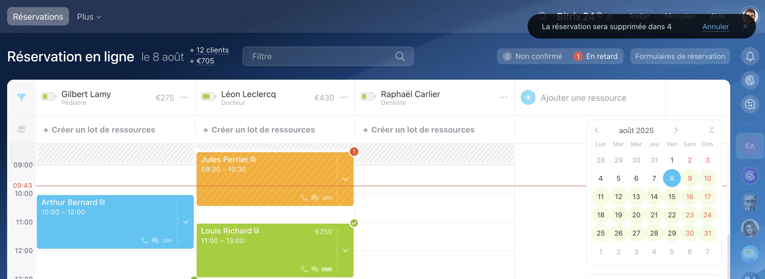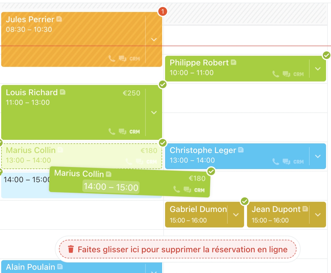 Les réservations sont codées par couleur pour indiquer clairement leur statut, comme confirmé, en retard, etc. Cela aide vous et votre équipe à naviguer rapidement dans le planning. -