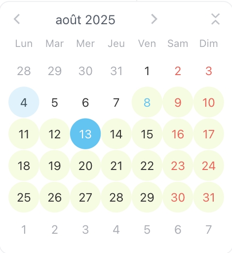 Cela permet aux utilisateurs de voir rapidement les jours disponibles à la réservation et ceux déjà complets.