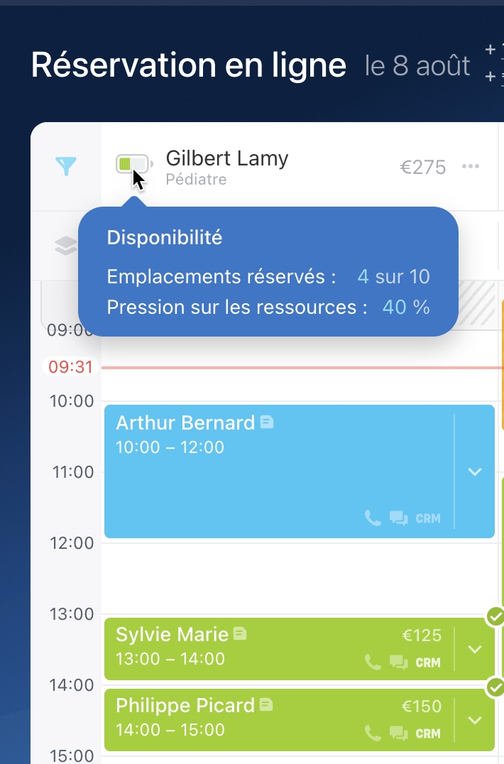 Survolez l'icône de batterie à côté d'une ressource pour voir le nombre de créneaux réservés et le pourcentage de charge de la ressource.