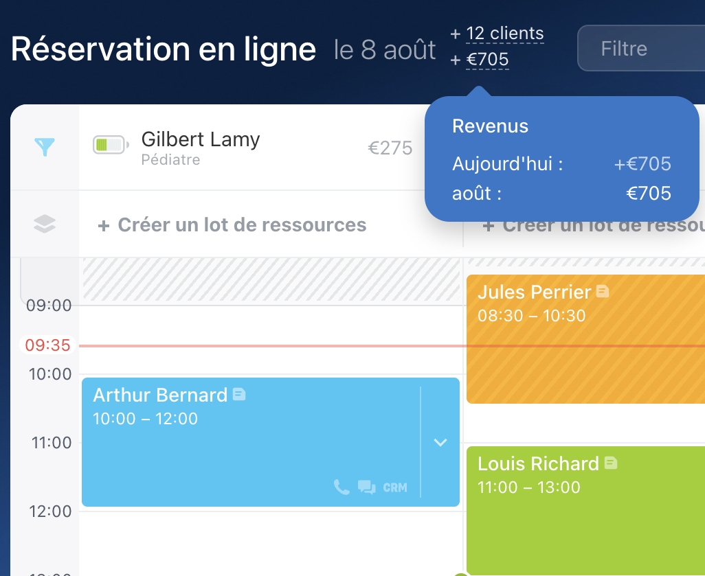 Vous pouvez également consulter le nombre de nouveaux clients, les revenus par ressource et le total de la journée. Ces informations sont basées sur le champ « Montant et devise » dans les transactions liées et affichent les données pour aujourd'hui.