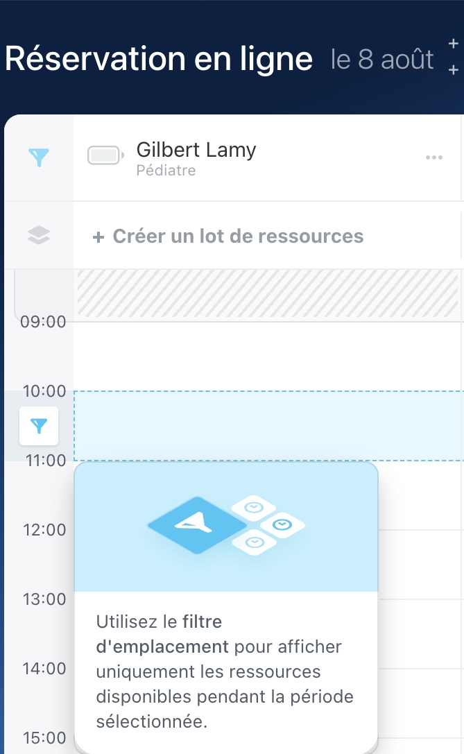 Utilisez-le pour afficher uniquement les ressources disponibles à l'heure sélectionnée.