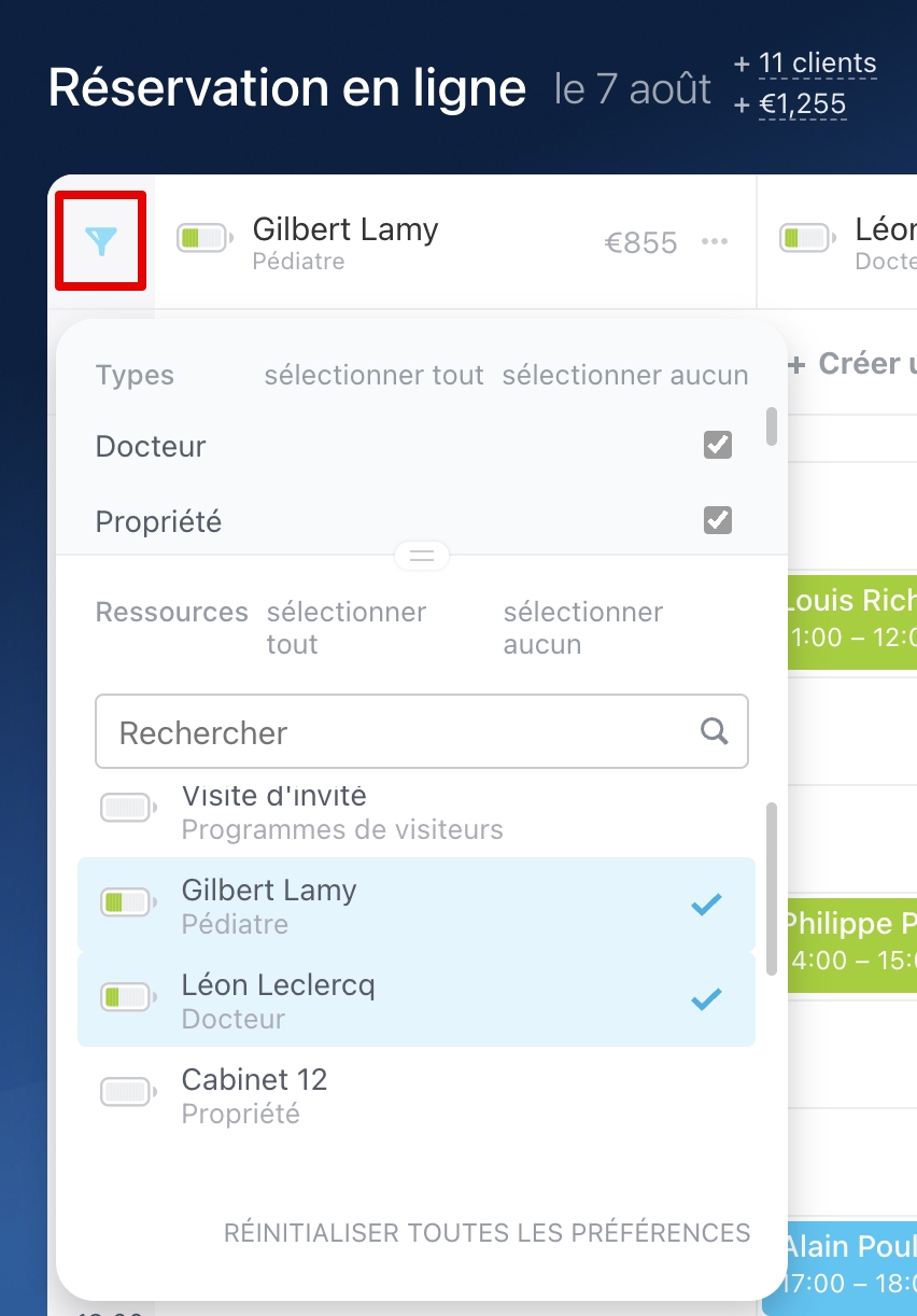Utilisez le filtre situé au-dessus du tableau de planification pour trouver des réservations en fonction de critères spécifiques, tels que la ressource, le contact, l'entreprise, la personne responsable ou le statut.