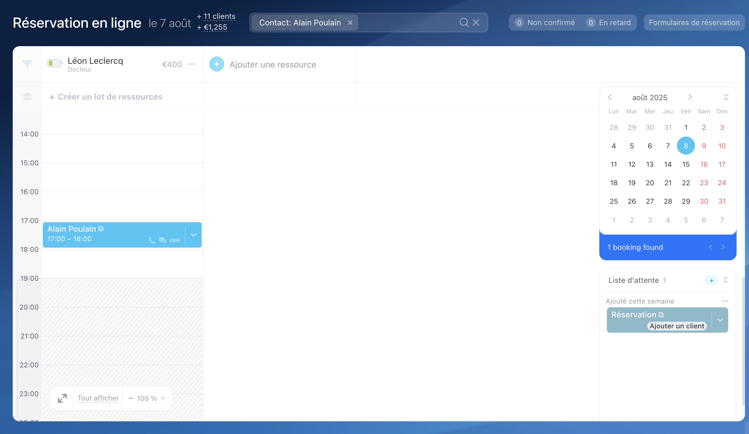 Par exemple, appliquez le filtre « Contact » pour afficher les réservations d'un client particulier à une date spécifique et mettez en évidence les jours du calendrier où il a d'autres rendez-vous.