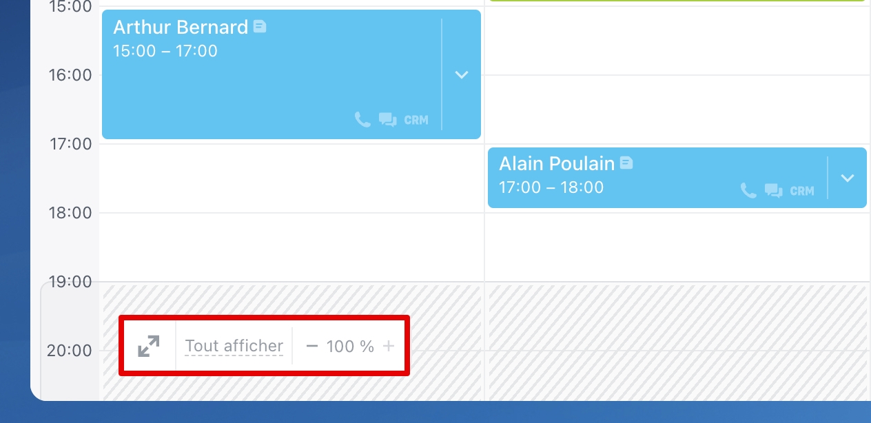 Si les réservations ne tiennent pas à l'écran, ajustez le niveau de zoom (–100%+). Utilisez le bouton « Tout afficher » pour afficher toutes les ressources et vérifier rapidement leur utilisation.