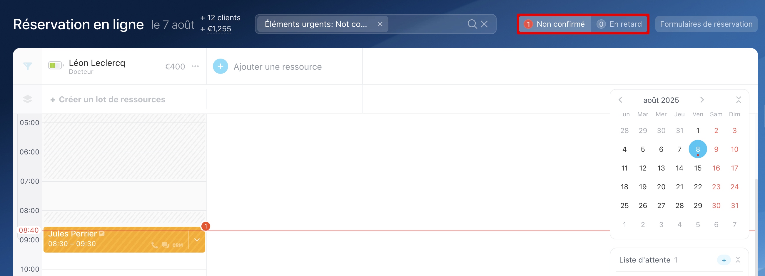 Les réservations nécessitant l'attention d'un agent sont marquées avec des compteurs spéciaux. Cliquez sur ces compteurs pour filtrer instantanément le tableau de planification et afficher uniquement les réservations pertinentes, comme les rendez-vous non confirmés ou en retard.