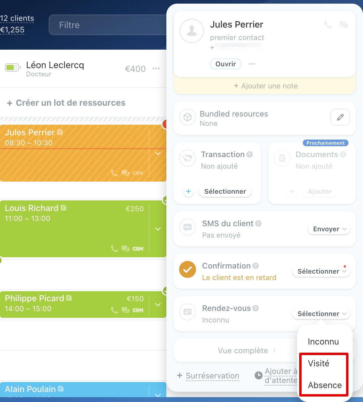 Pour suivre la présence sur le tableau de planification, cliquez sur la flèche à côté de la réservation, sélectionnez « Rendez-vous » et marquez le statut comme « Visité » ou « Absent ».