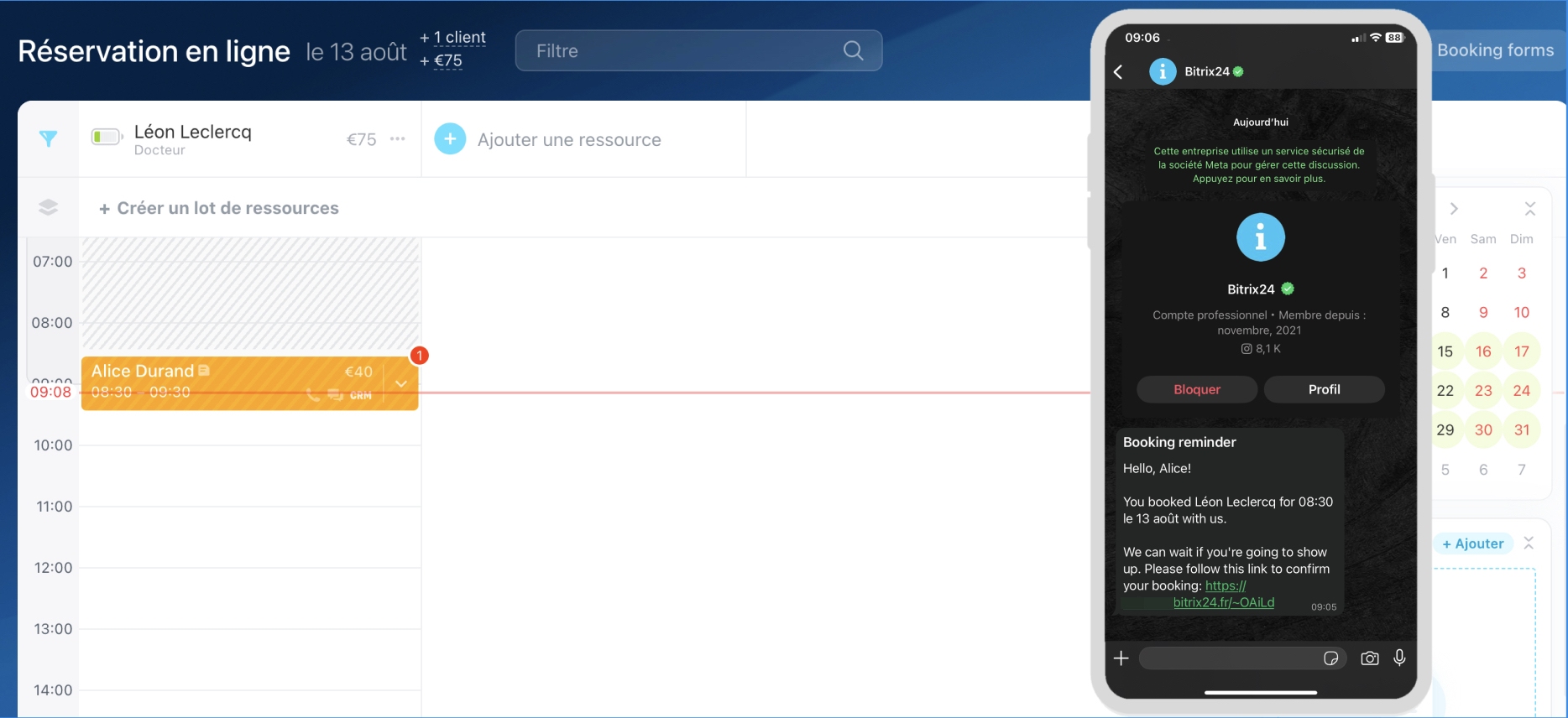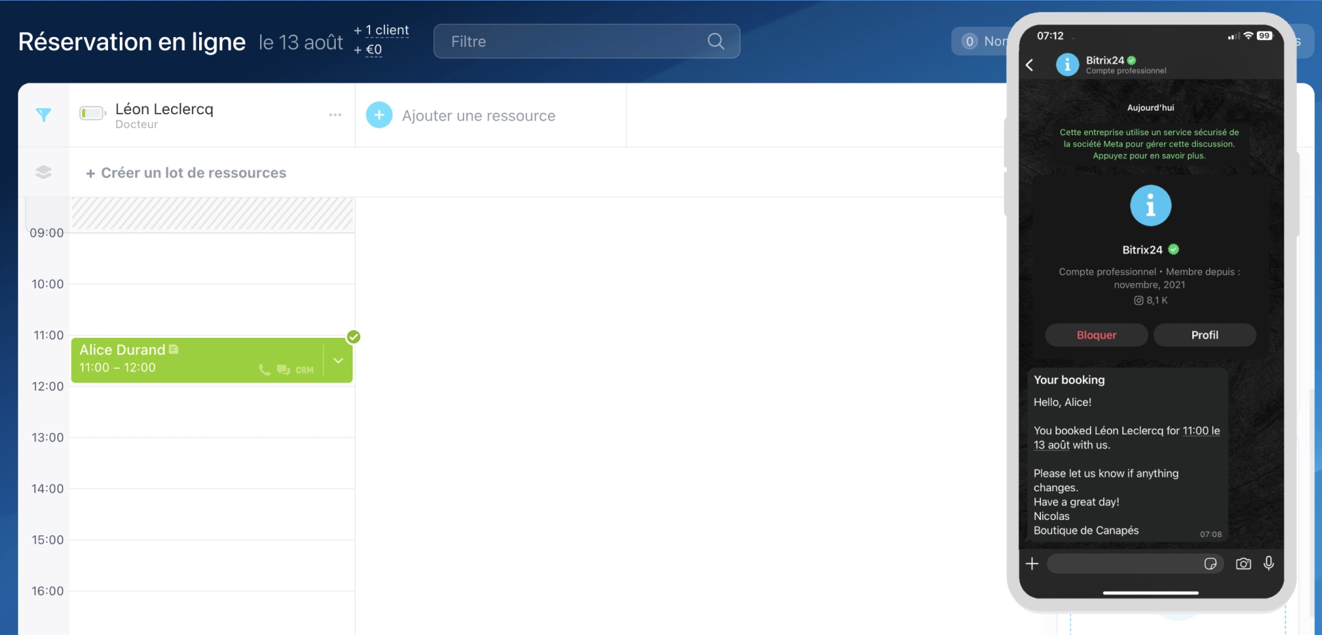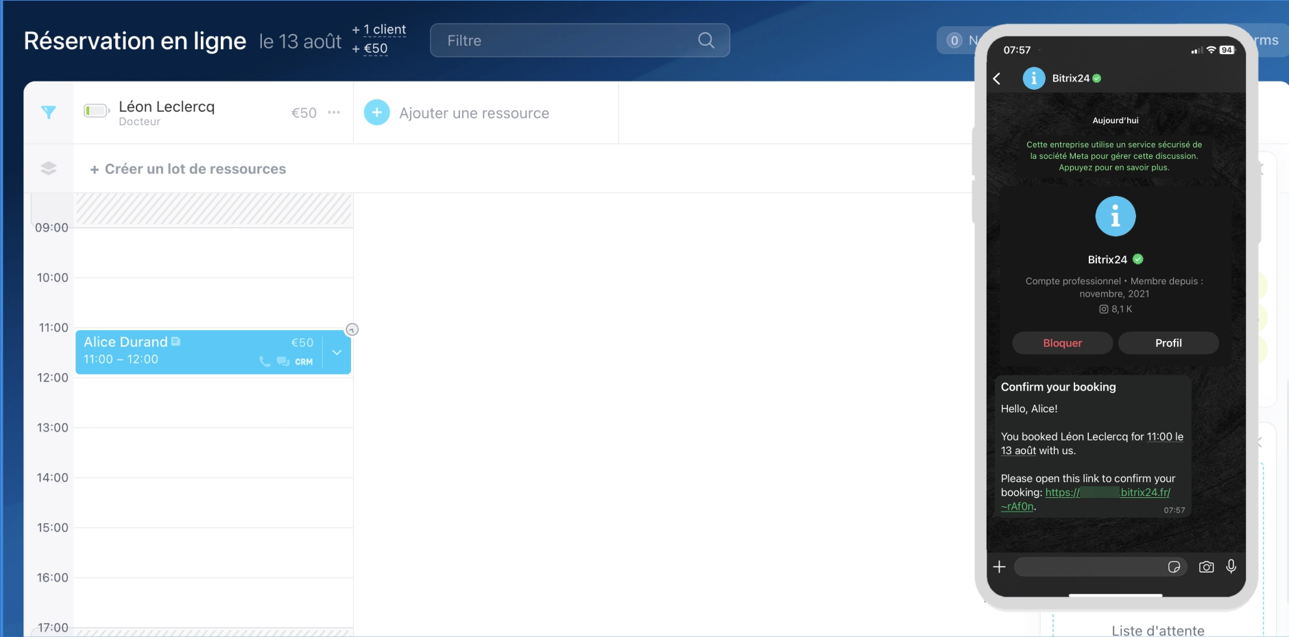 Quelle que soit l'option choisie, Bitrix24 leur envoie automatiquement des messages pour réduire les absences et s'assurer qu'ils n'oublient pas leur rendez-vous.
