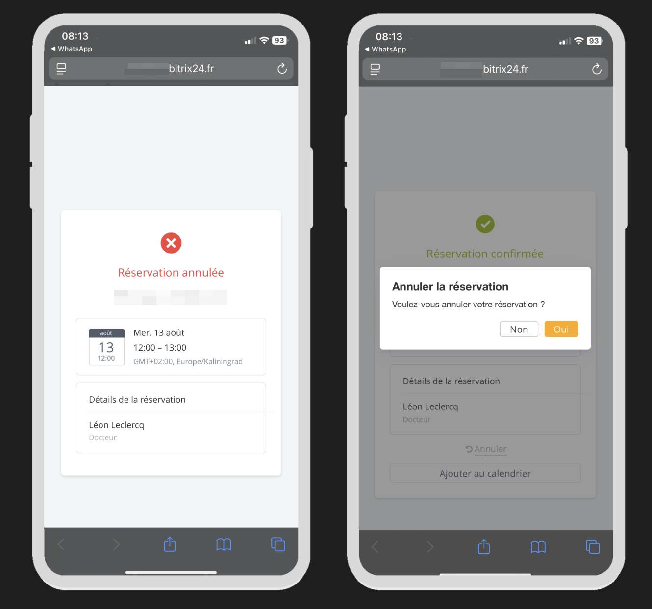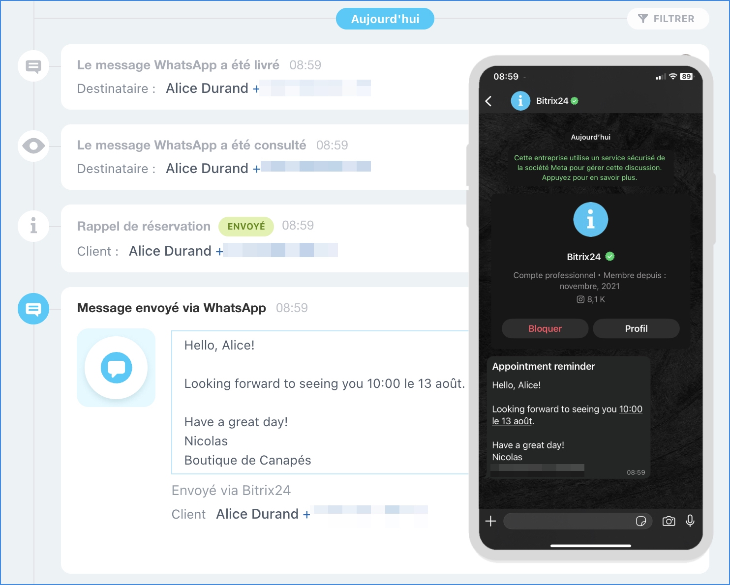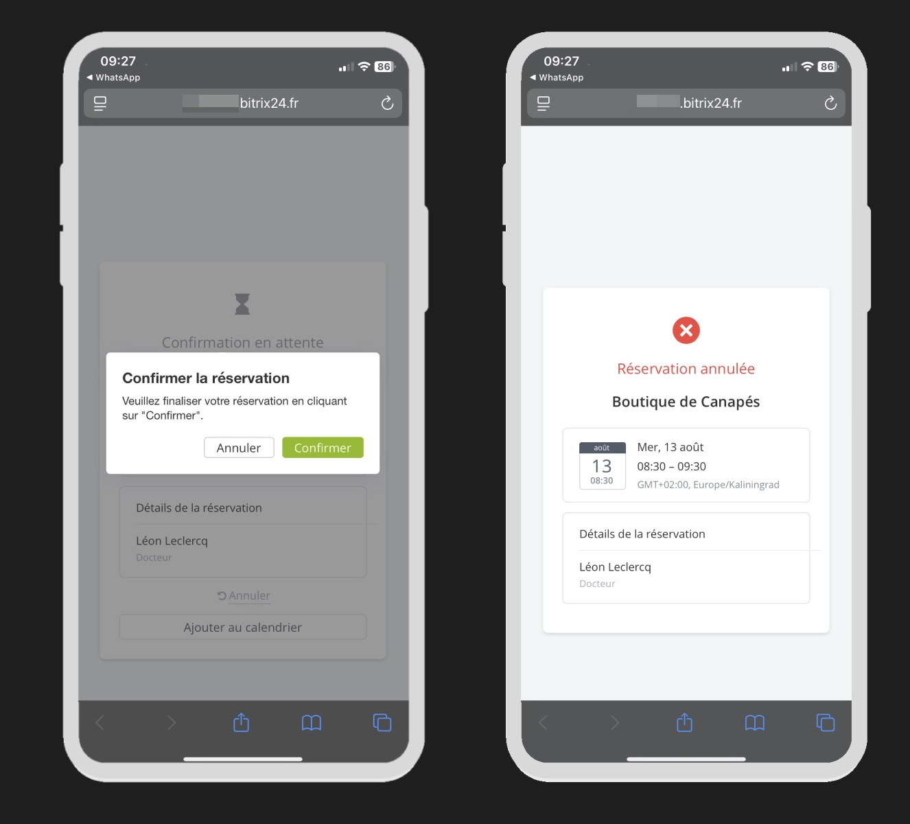 Quelle que soit l'option choisie, Bitrix24 leur envoie automatiquement des messages pour réduire les absences et s'assurer qu'ils n'oublient pas leur rendez-vous.