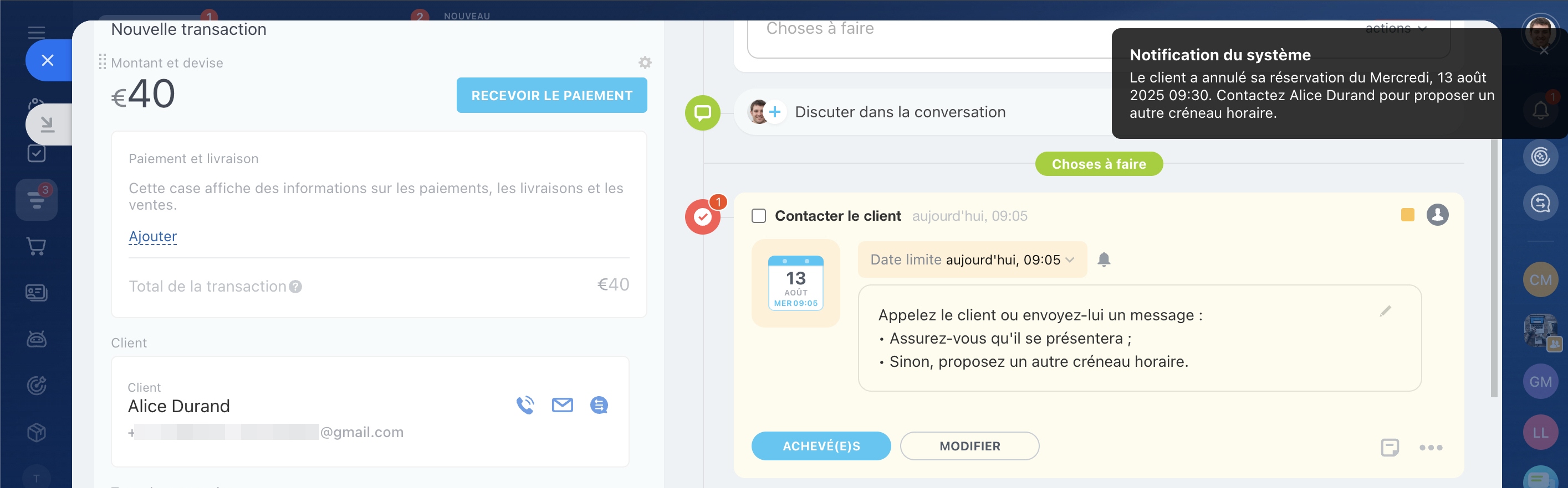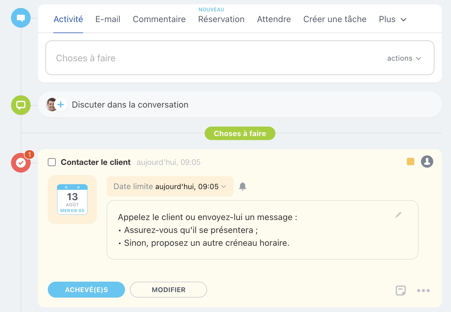 Si la réservation n'est toujours pas confirmée, une activité CRM est automatiquement créée pour rappeler à l'agent de contacter le client.