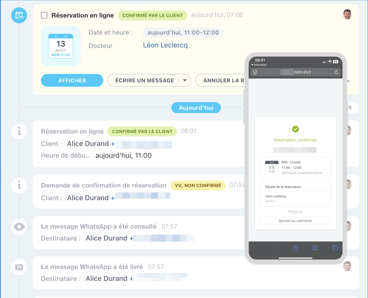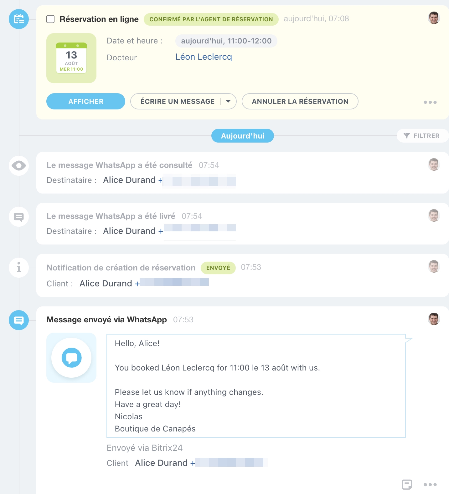 Vous pouvez suivre les confirmations de réservation et l'historique des messages en temps réel dans le CRM.