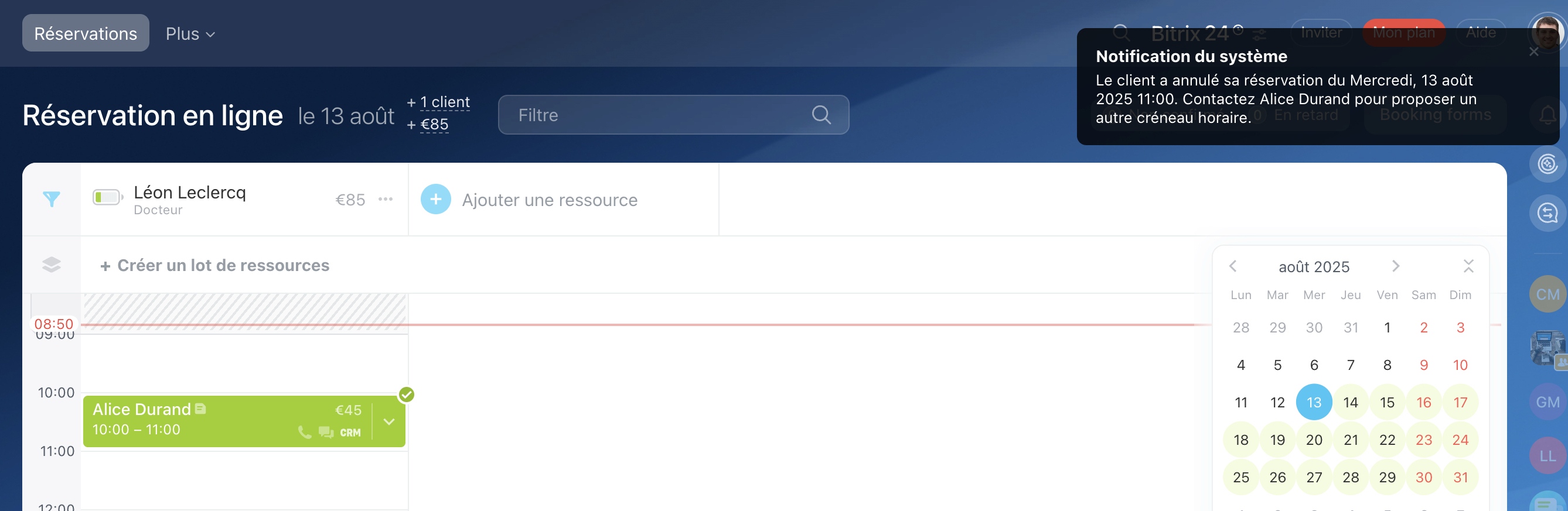 Lorsqu'une réservation est annulée, l'agent est notifié et le créneau horaire redevient disponible sur le tableau de planification.