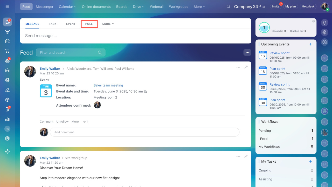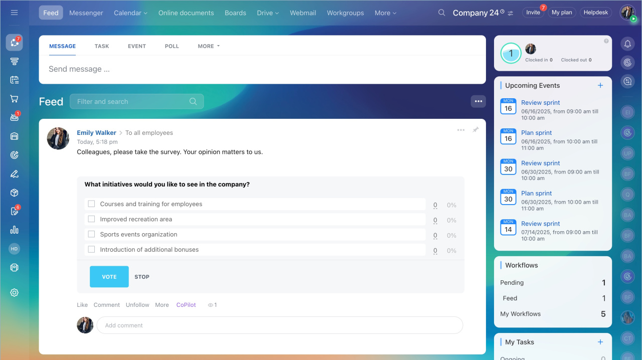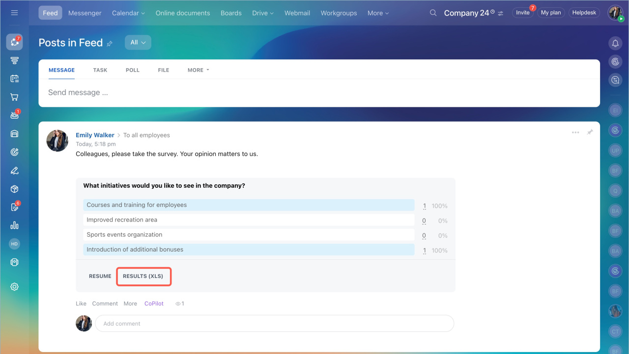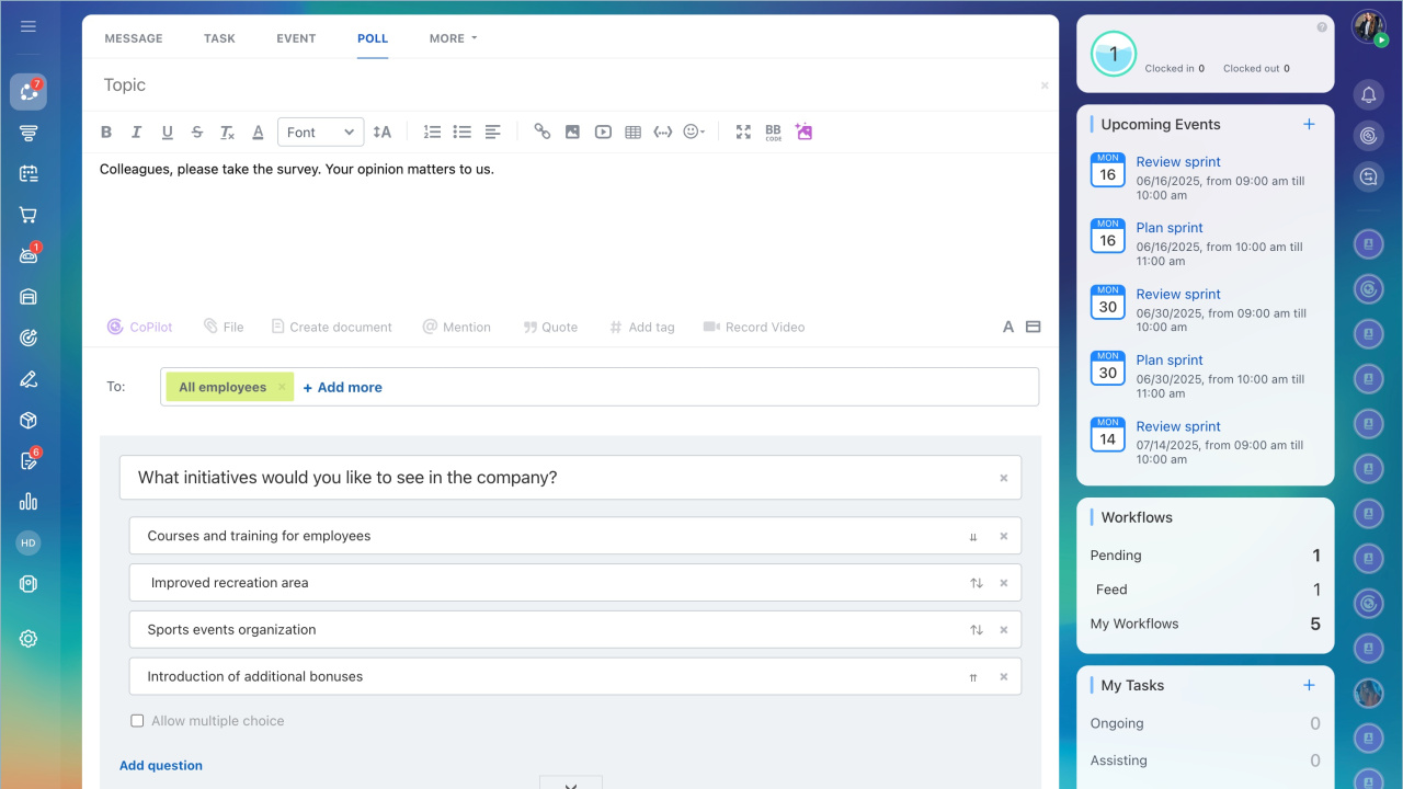 Pour créer un sondage auprès des employés de votre entreprise, sélectionnez Sondage dans le menu de flux d'actualités. Indiquez le sujet de sondage, écrivez un message aux employés et sélectionnez les destinataires.