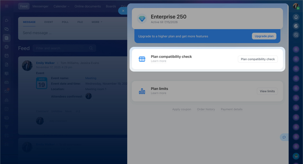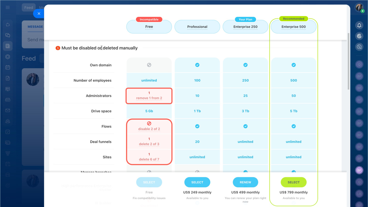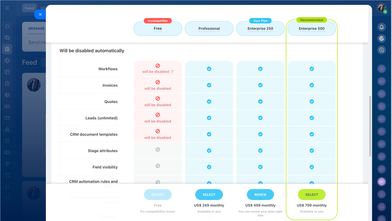 Lorsque votre plan arrive à expiration, vous devez le renouveler dans un délai de 15 jours ou choisir un autre plan adapté à vos besoins. Si vous décidez d’en changer, l’outil Contrôle de compatibilité du plan affichera les plans compatibles avec les fonctionnalités actuellement activées sur votre compte Bitrix24.
