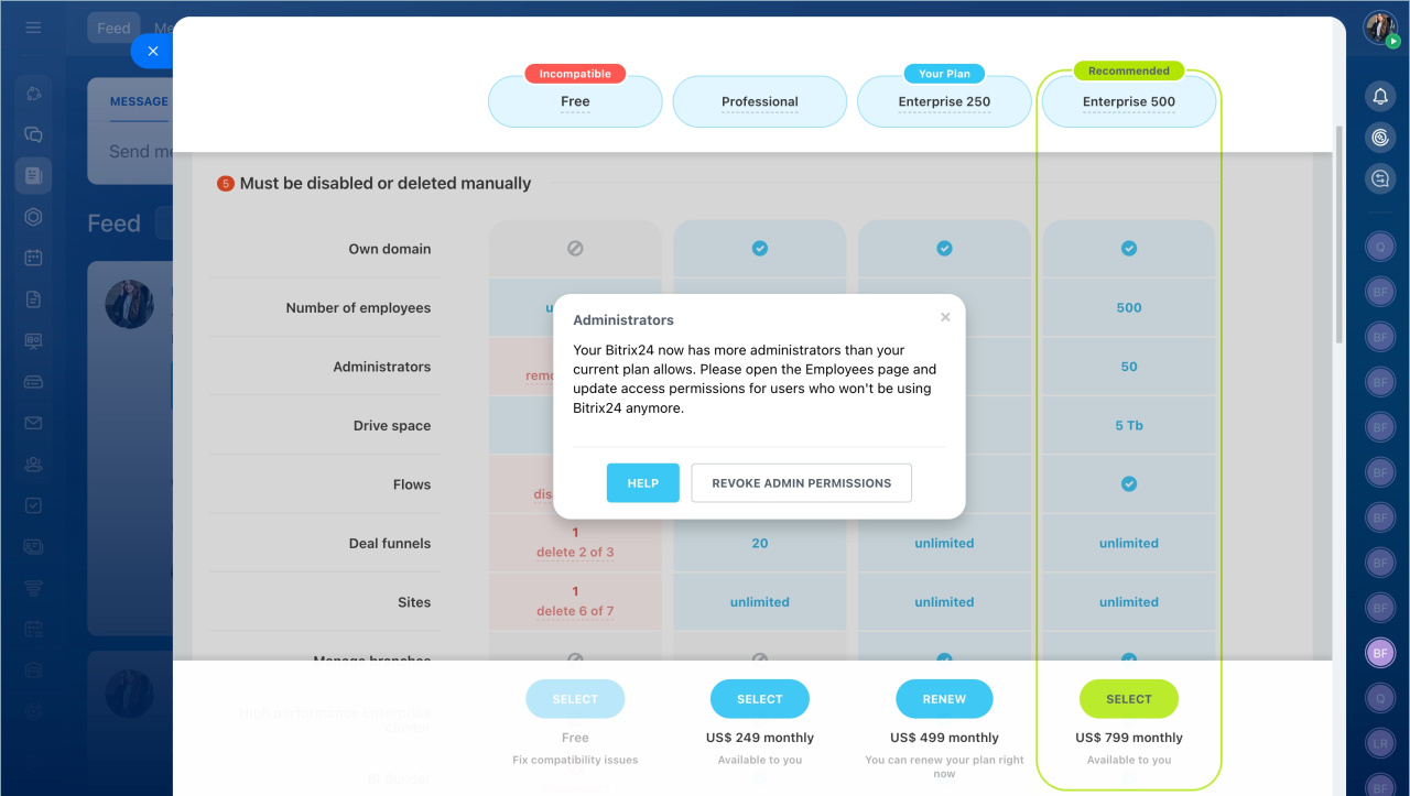 - Administrateurs - si vous dépassez le nombre d'administrateurs Bitrix24, vous devez retirer les droits des administrateurs actuels pour s'adapter au plan.