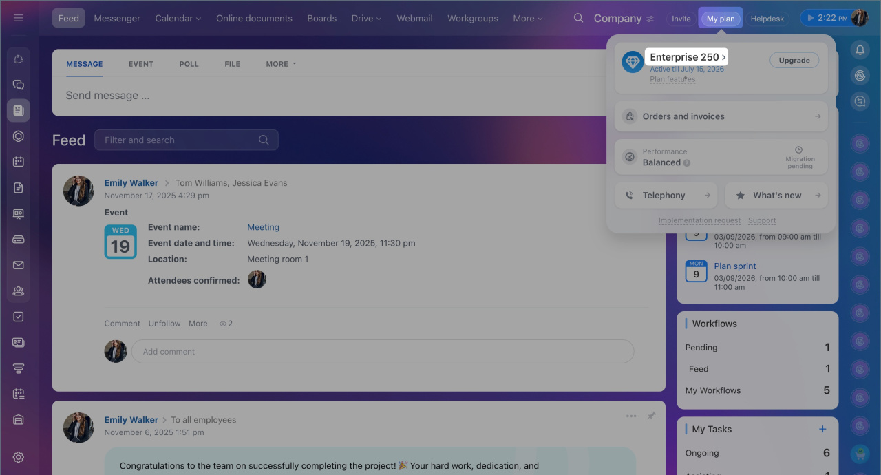 - Cluster Enterprise haute performance - lors de la connexion au plan Enterprise, votre Bitrix24 est transféré sur demande vers une infrastructure dédiée spéciale. Pour changer de plan tarifaire, vous devez d'abord contacter le support technique pour transférer votre Bitrix24 vers un serveur standard.