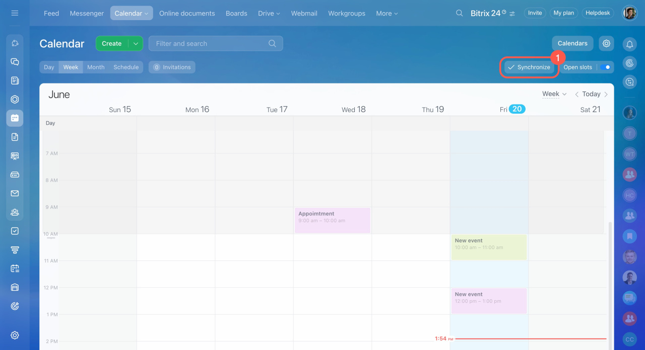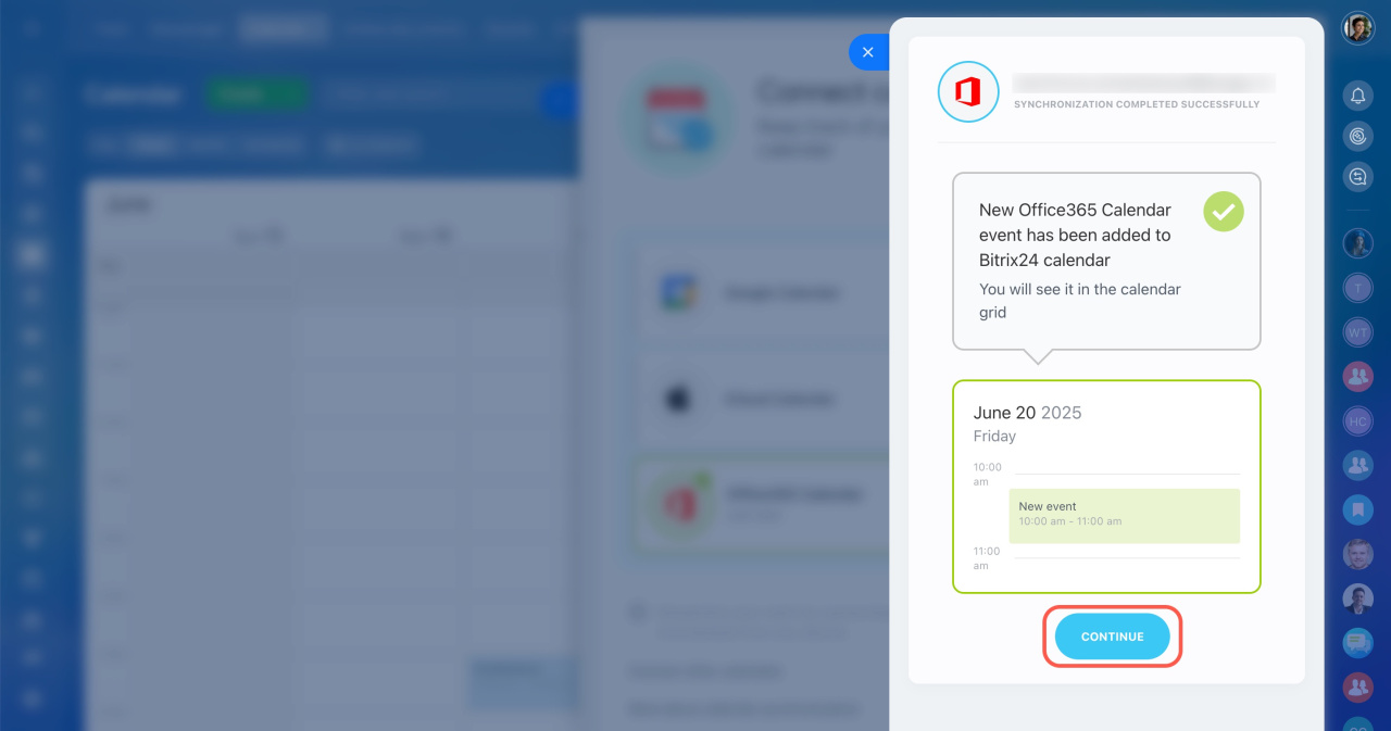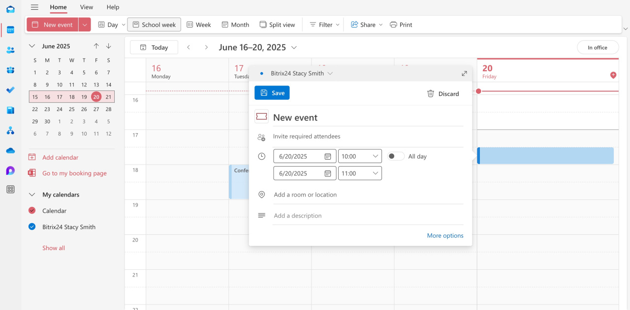 Vérifiez que la synchronisation fonctionne. Pour cela faire, créez un événement dans le calendrier Office365, et il apparaîtra immédiatement dans le calendrier Bitrix24.