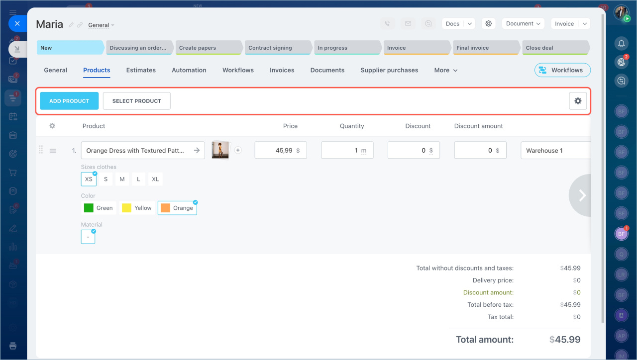 Le processus de travail avec les services est le même qu'avec les produits ordinaires. Ils peuvent être ajoutés aux éléments CRM, affichés dans des documents et utilisés dans des règles d'automatisation.