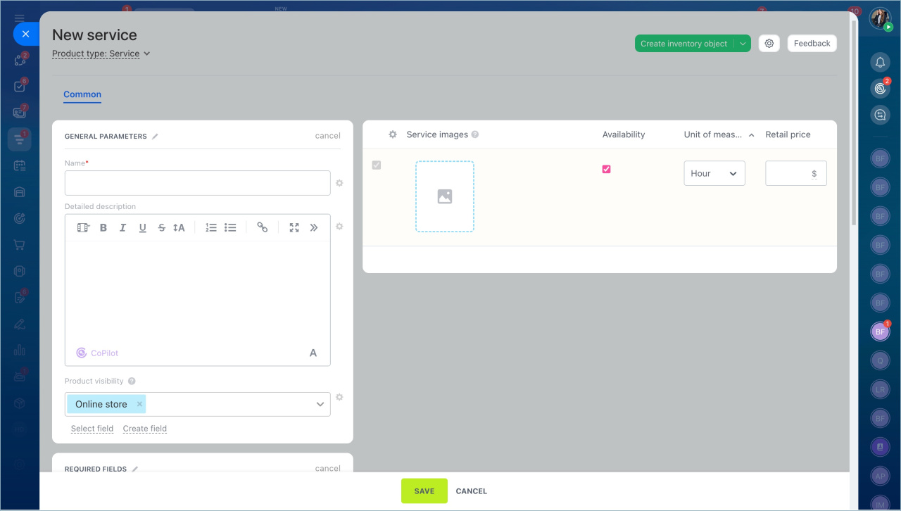 Dans cette mise à jour, nous avons fait des services comme un type distinct d'articles et ils diffèrent des articles ordinaires en ce qu'ils n'ont pas de variantes et ils ne sont pas utilisés dans la gestion des stocks, c'est-à-dire qu'ils ne sont pas tenus de soldes, les services ne doivent pas être enregistrés dans l'entrepôt, etc. Cela simplifie grandement le travail dans le CRM, maintenant la facturation, la création de transactions et d'autres éléments avec les services est devenu beaucoup plus facile.