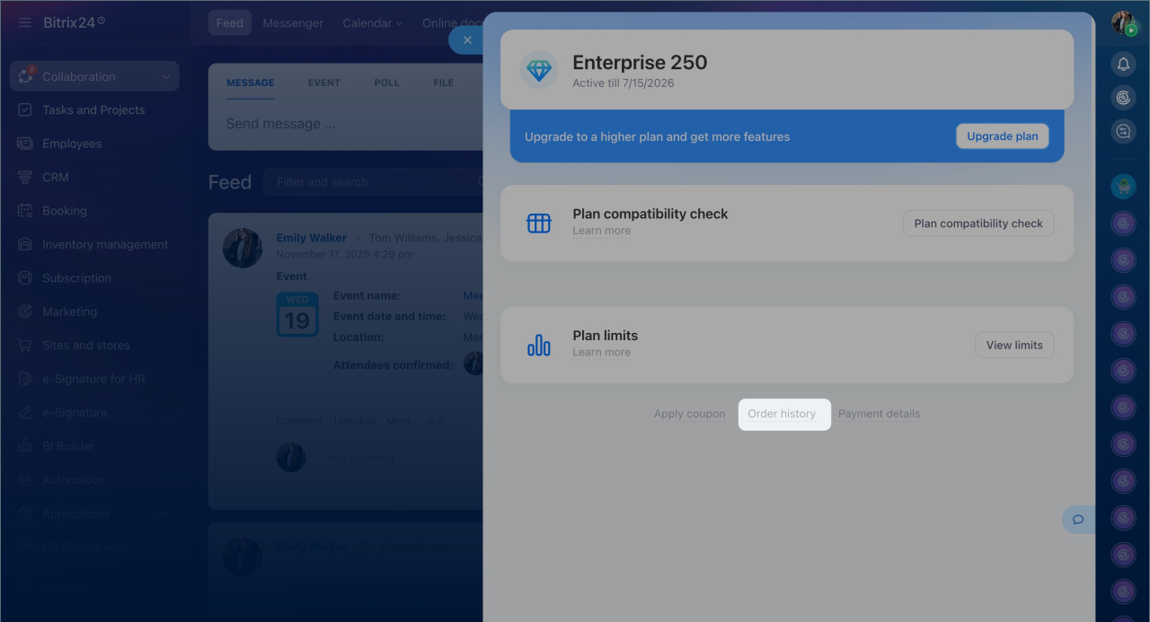 Si le renouvellement automatique n'a pas fonctionné dans votre compte Bitrix24, nous vous recommandons de vérifier l'état du renouvellement automatique de votre abonnement. Accédez à Abonnement et cliquez sur le nom de votre plan, puis sur Historique d'achat.