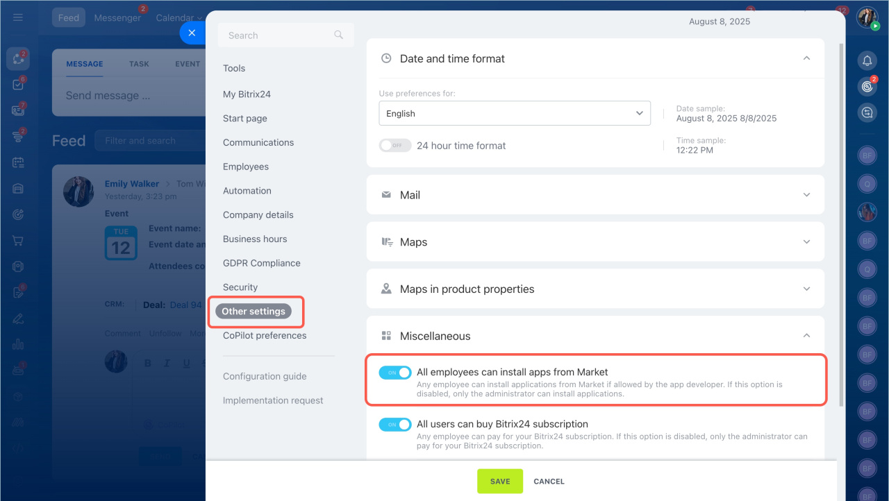 Dans le menu de gauche, accédez à la section Paramètres - Autres paramètres - Divers. Activez l'option Tous les employés peuvent installer des applications à partir de Market et enregistrez les modifications.
