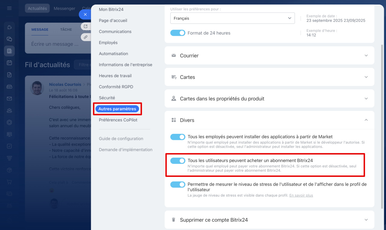 Par défaut, la page Historique d’achat est accessible uniquement aux administrateurs du compte. Les autres utilisateurs peuvent y accéder si l’option Tous les utilisateurs peuvent acheter un abonnement Bitrix24 est activée dans les paramètres de votre compte.