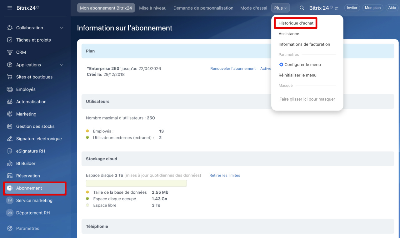 Si vous avez acheté un abonnement commercial dans votre compte Bitrix24, vous pouvez trouver votre facture sous Abonnement - Plus - Historique d’achat.