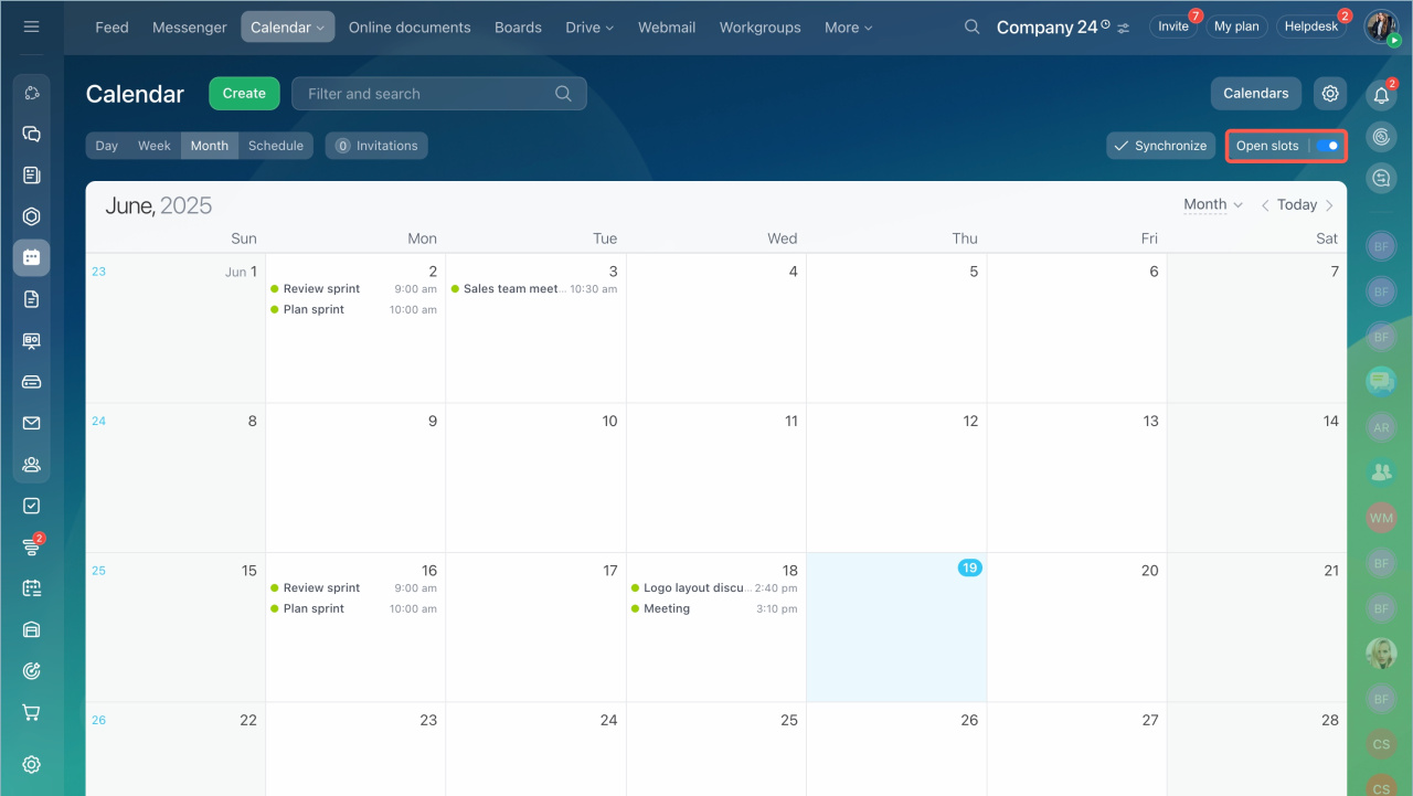 Accédez à la section Mon calendrier et cliquez sur le bouton pour activer Créneaux disponibles. Le lien vers votre planning sera copié automatiquement. Envoyez-le à un utilisateur externe par e-mail ou via des messageries instantanées.