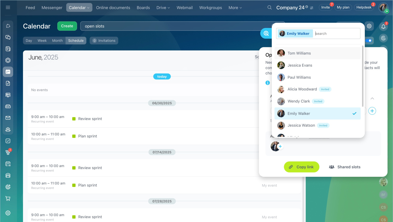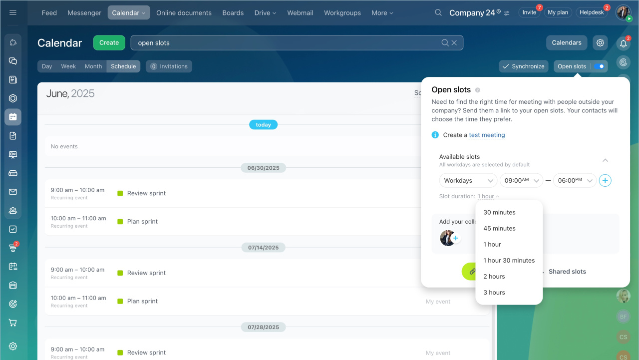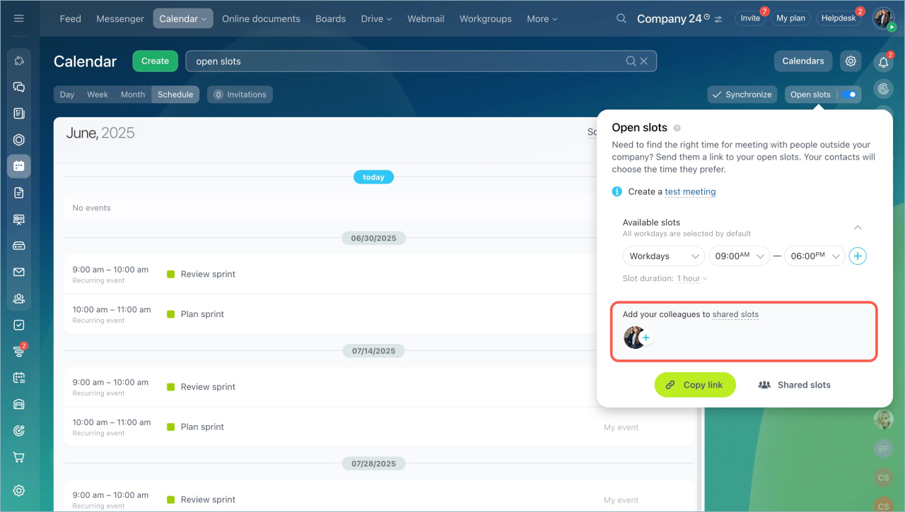Cliquez sur Partager des créneaux et partagez le lien de planification avec des utilisateurs externes. Les créneaux horaires disponibles dans le planning seront affichés en tenant compte de la disponibilité de tous les collègues invités.