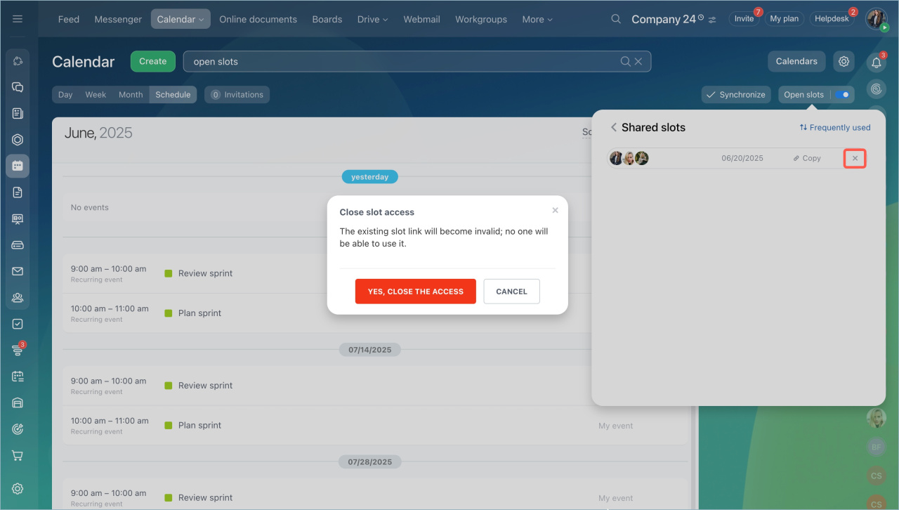 Fermez l'accès aux liens vers des créneaux partagés avec des collègues. Pour cela faire, cliquez sur Supprimer (x) à côté du lien.