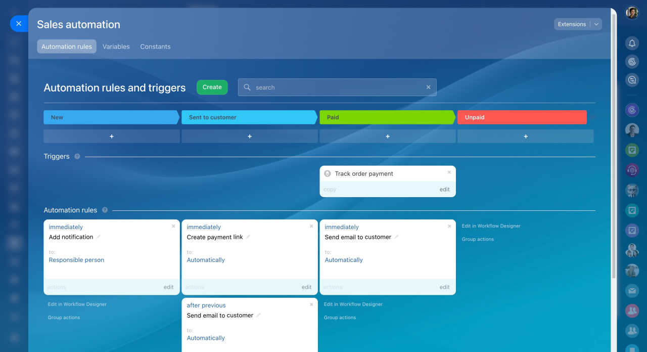 Les factures ont désormais des règles d'automatisation, des déclencheurs et des processus d'affaires. Vous pouvez désormais automatiser le déplacement des factures entre les étapes, la génération et l'envoi des documents aux clients.