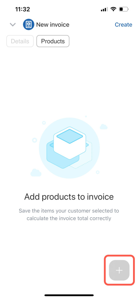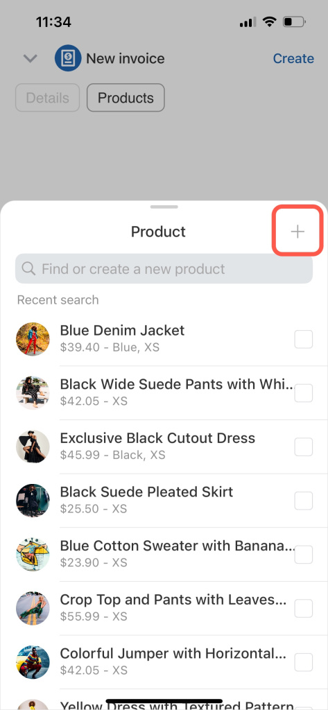 Sélectionnez ou créez un nouvel article pour l'ajouter à votre facture. Cliquez sur l'onglet Produits dans le menu supérieur du formulaire de facture. Cliquez sur l'icône + dans le coin inférieur droit. Sélectionnez un produit existant dans la liste ou ajoutez-en un nouveau.