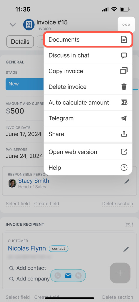 Les factures dans l'application mobile prennent en charge l'utilisation de documents. Ajoutez un nouveau document ou utilisez un modèle.