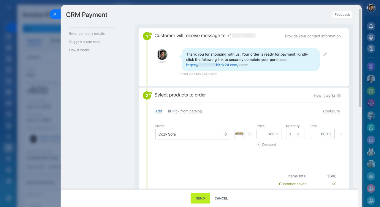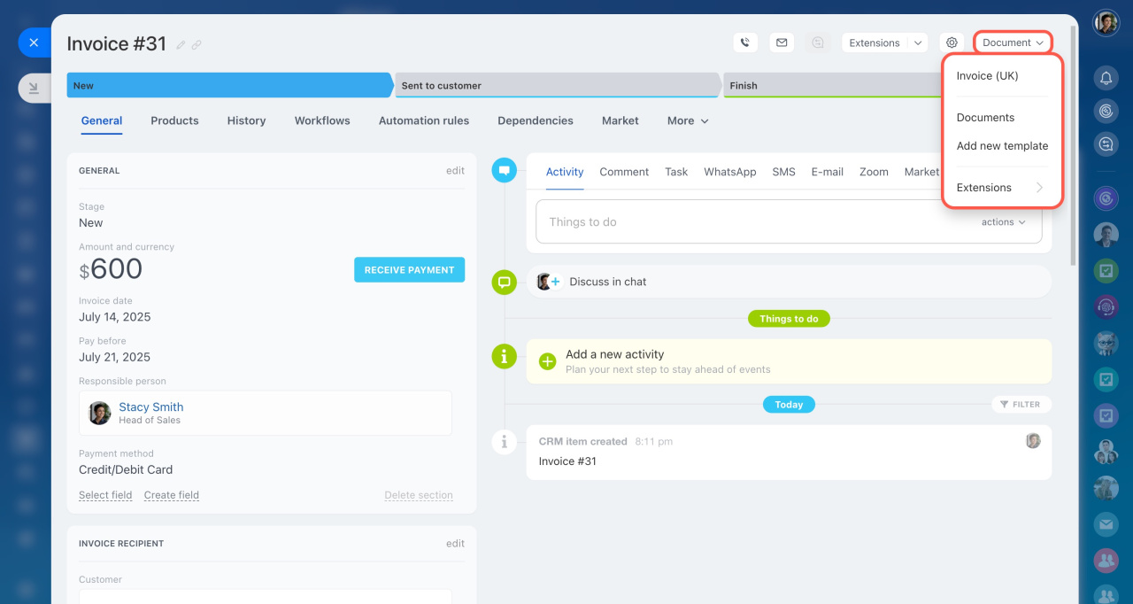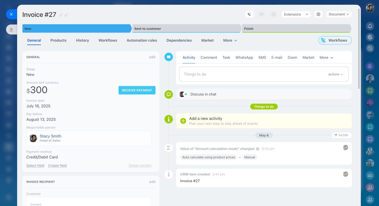 Maintenant, le formulaire ressemble à celui des transactions et des autres éléments. Il dispose désormais d'une chronologie, d'onglets avec des règles d'automatisation et des processus d'affaires, ainsi que la possibilité d'accepter des paiements.
