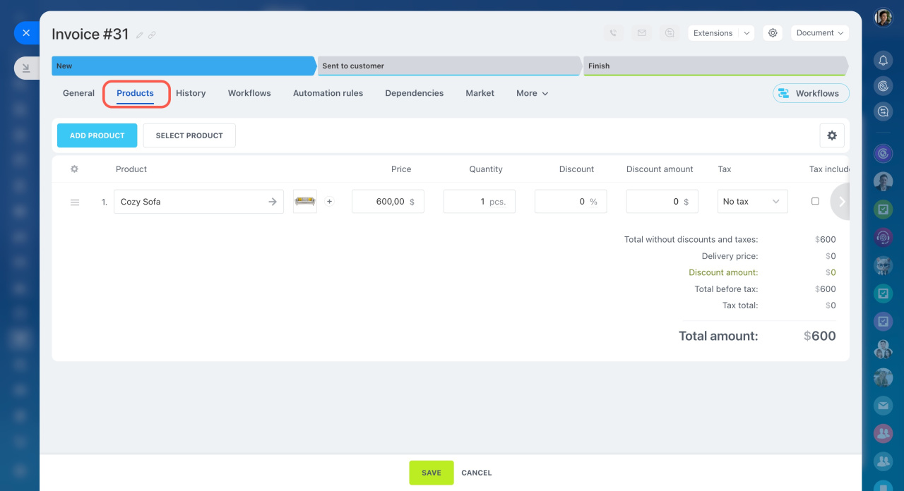 Désormais, les factures prennent en charge le travail avec des variantes et des devis, et vous pouvez créer un nouveau produit directement dans le formulaire de facture.
