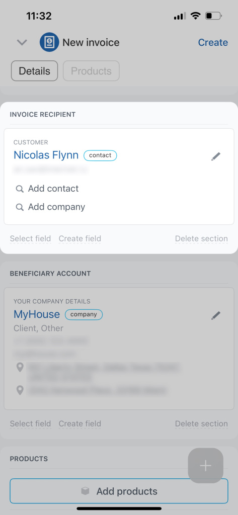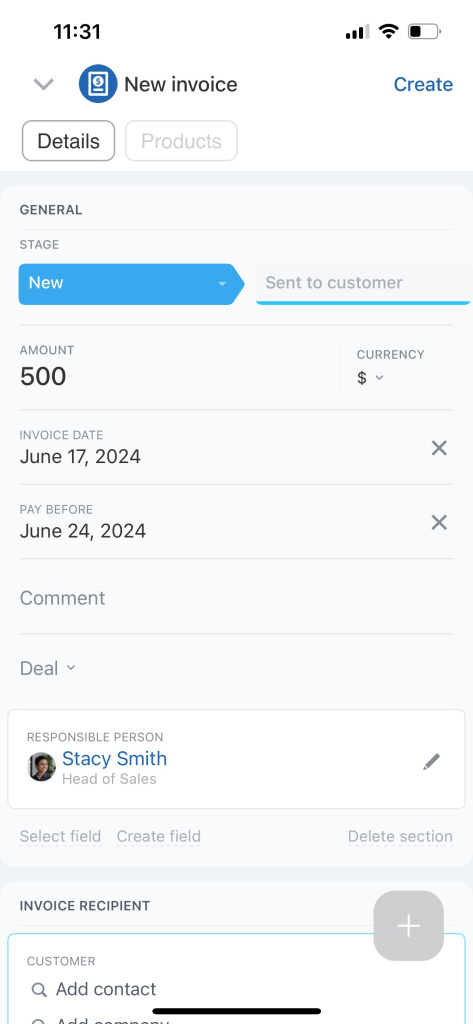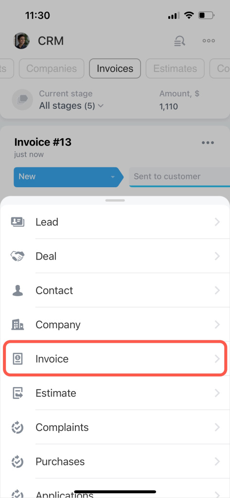 Accédez à CRM. Dans les sections du menu supérieur, recherchez la section Factures. Touchez l'icône + dans le coin inférieur droit et sélectionnez Facture