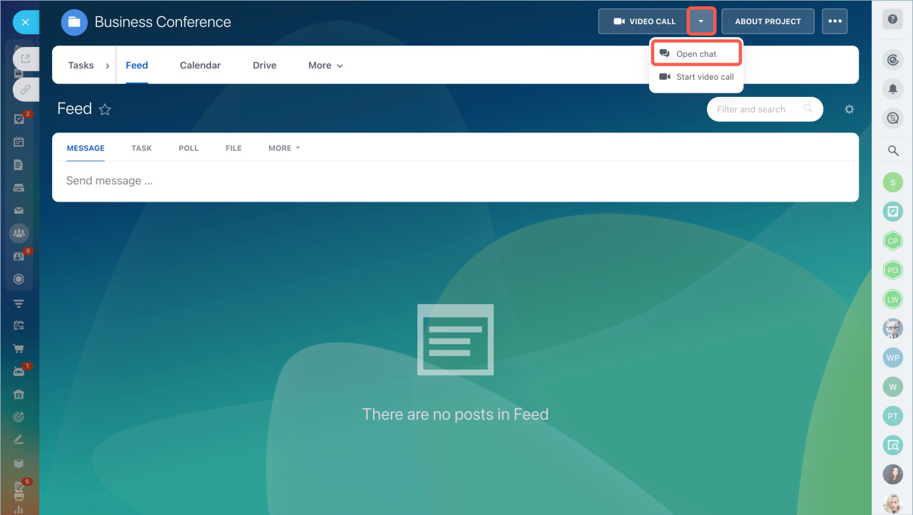 Dans Bitrix24, vous pouvez créer des chats liés à des groupes de travail et à des projets individuels. Dans ce cas, tous les membres du groupe ou du projet seront automatiquement connectés à ce chat.