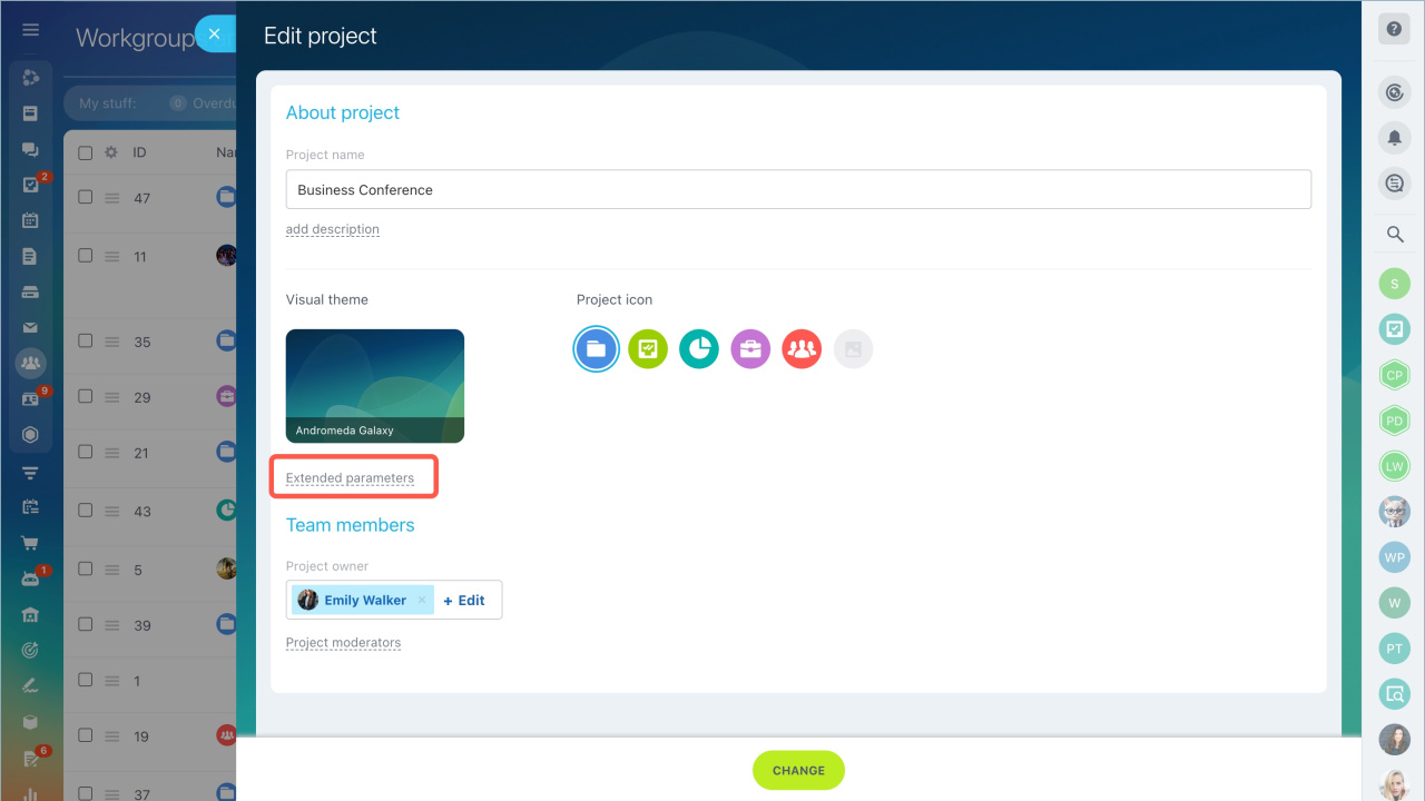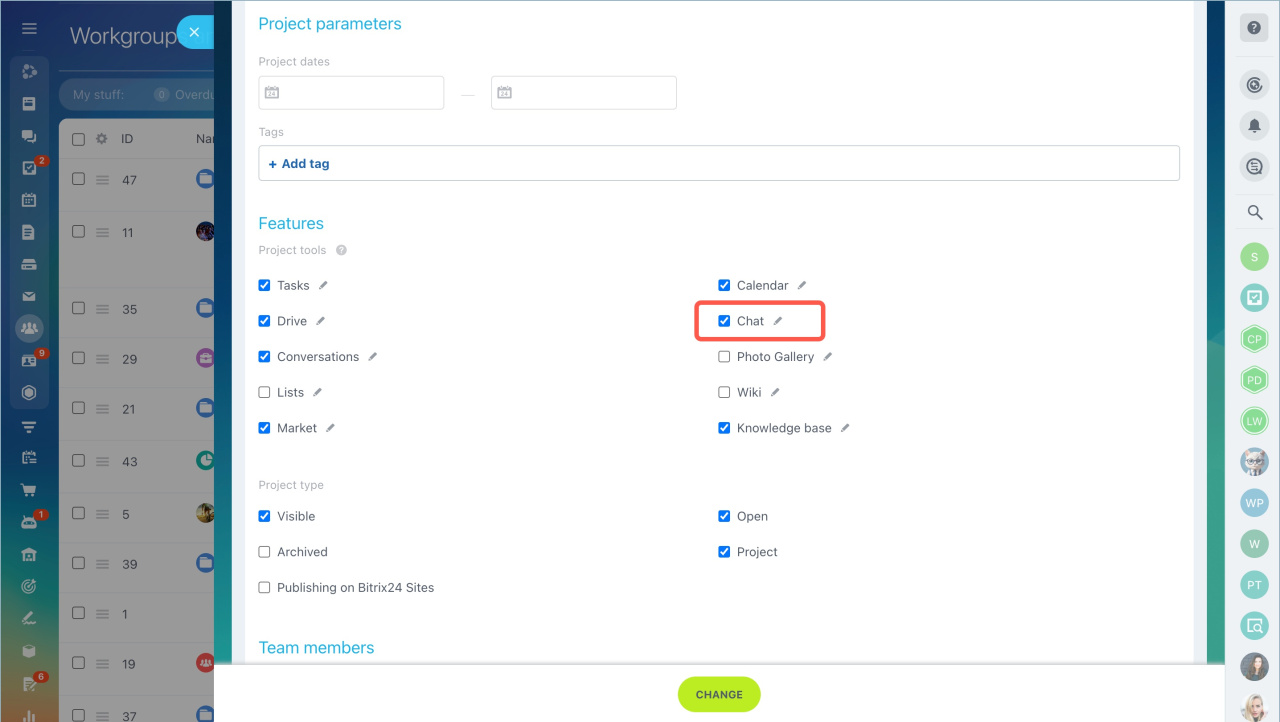 Vous pouvez activer le chat d'un groupe ou d'un projet à la fois lors de sa création et lors de sa modification ultérieure.