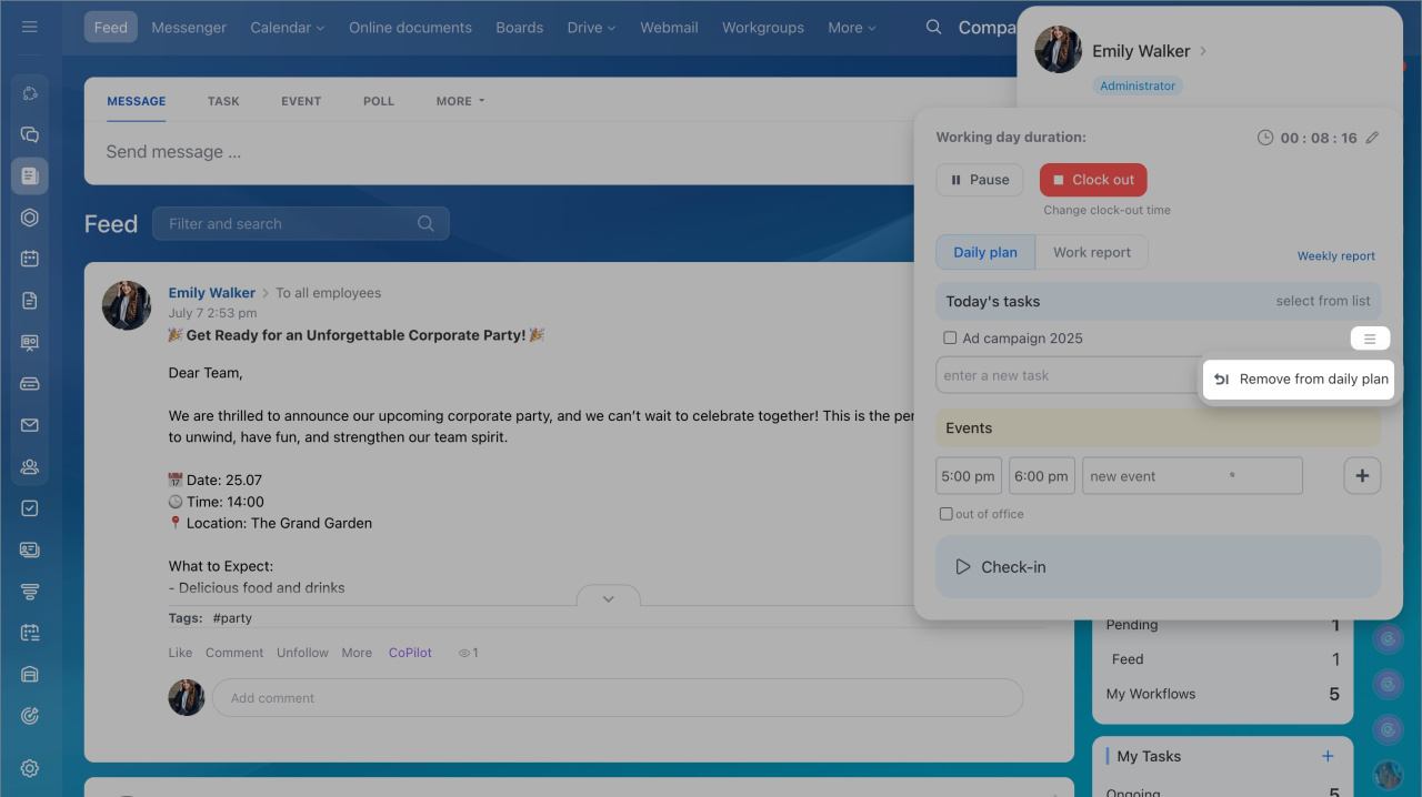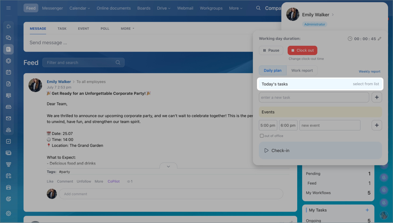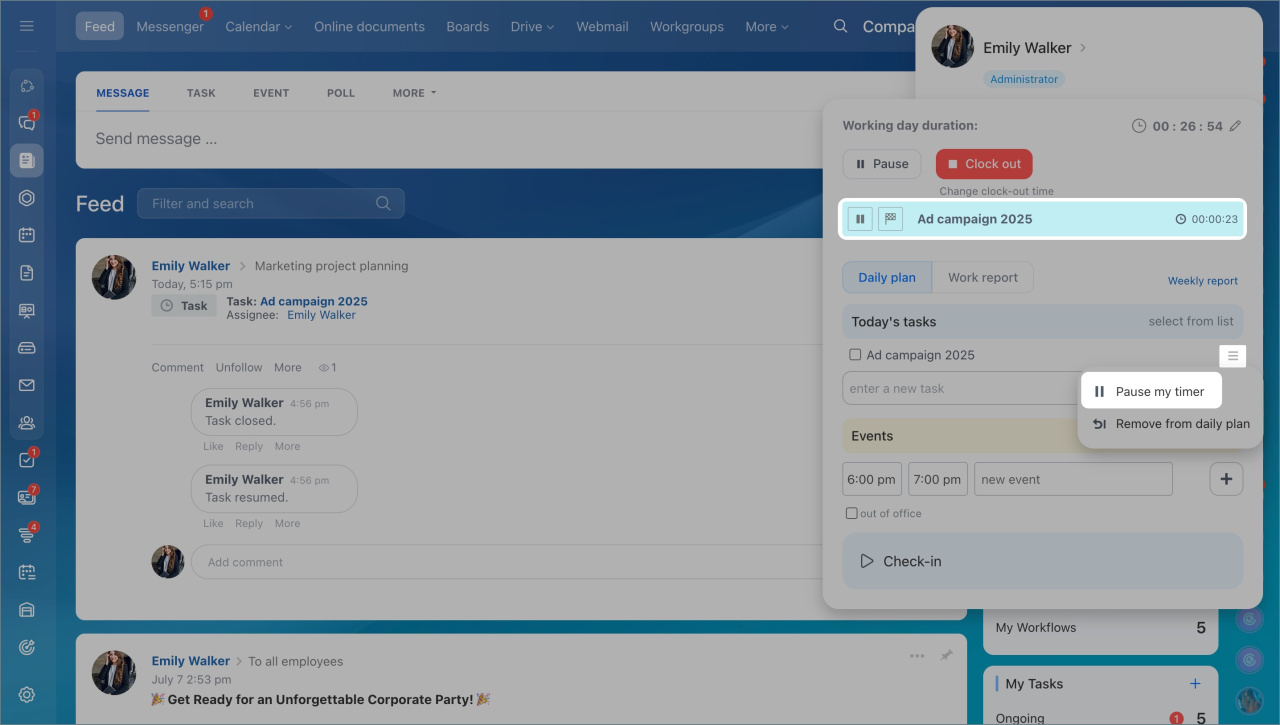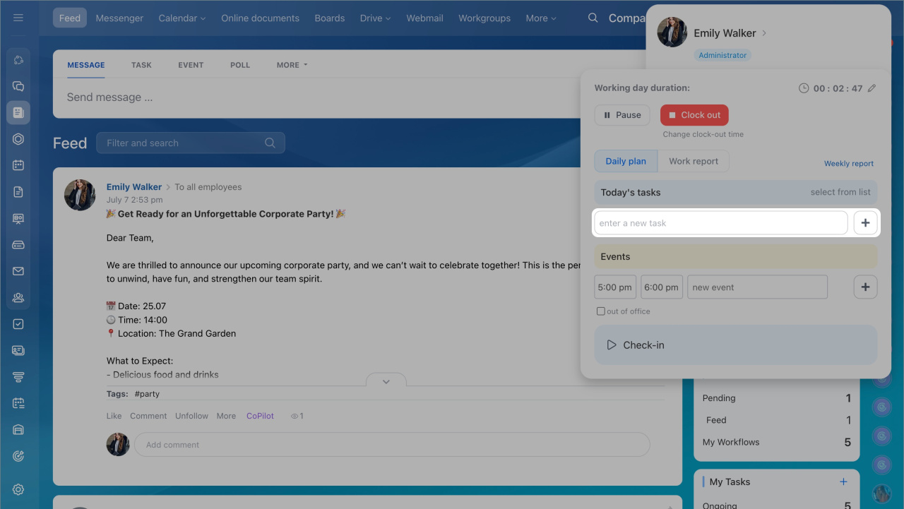 Imaginez, en plus du travail principal, vous avez plusieurs tâches de nature différente - écrire un rapport urgent ou tenir une réunion. Ces événements sont apparus de façon inattendue, et pour ne pas les oublier, écrivez-les dans un plan de tâches pour la journée. Pour cela faire, ouvrez le panneau Journée de travail, qui se trouve dans le menu supérieur de votre compte.