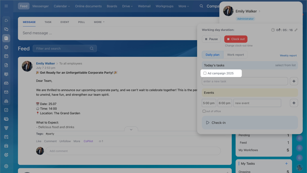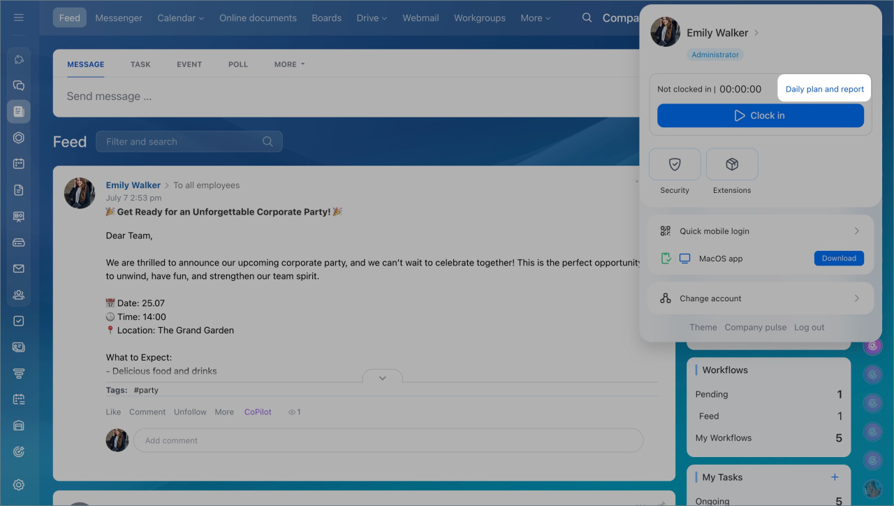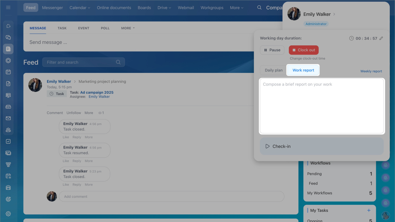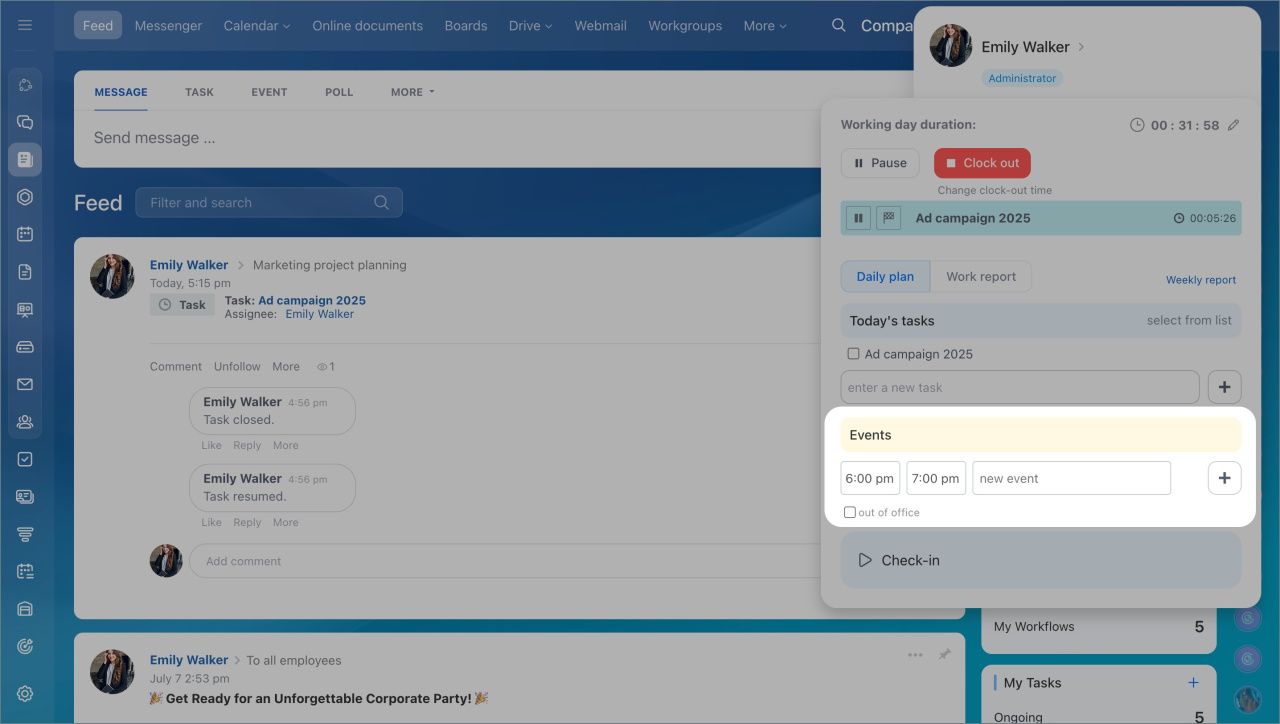 Imaginez, en plus du travail principal, vous avez plusieurs tâches de nature différente - écrire un rapport urgent ou tenir une réunion. Ces événements sont apparus de façon inattendue, et pour ne pas les oublier, écrivez-les dans un plan de tâches pour la journée. Pour cela faire, ouvrez le panneau Journée de travail, qui se trouve dans le menu supérieur de votre compte.