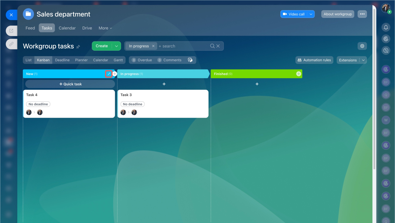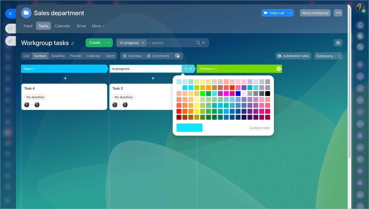 - Vous pouvez ajouter de nouvelles colonnes au tableau, modifier leurs noms et leurs couleurs - toutes les modifications seront immédiatement visibles pour les autres membres du groupe ou du projet.
