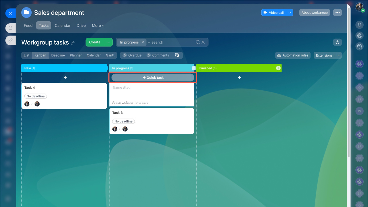 - Le mode Kanban a une fonctionnalité pour créer des tâches rapides.