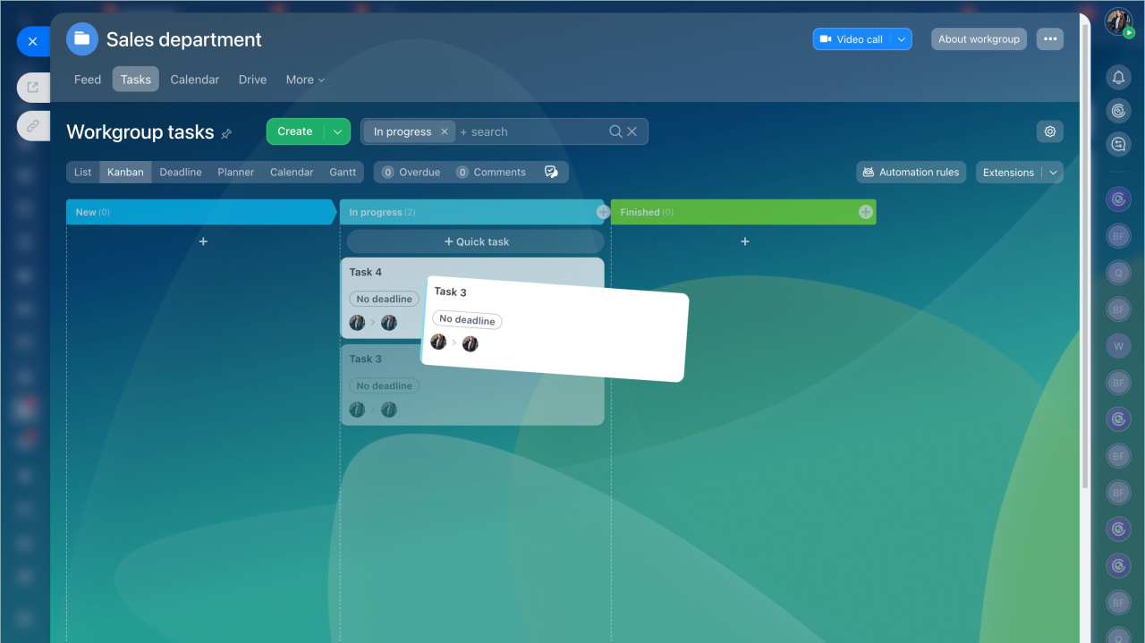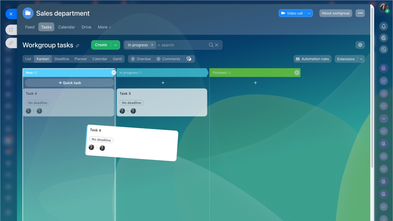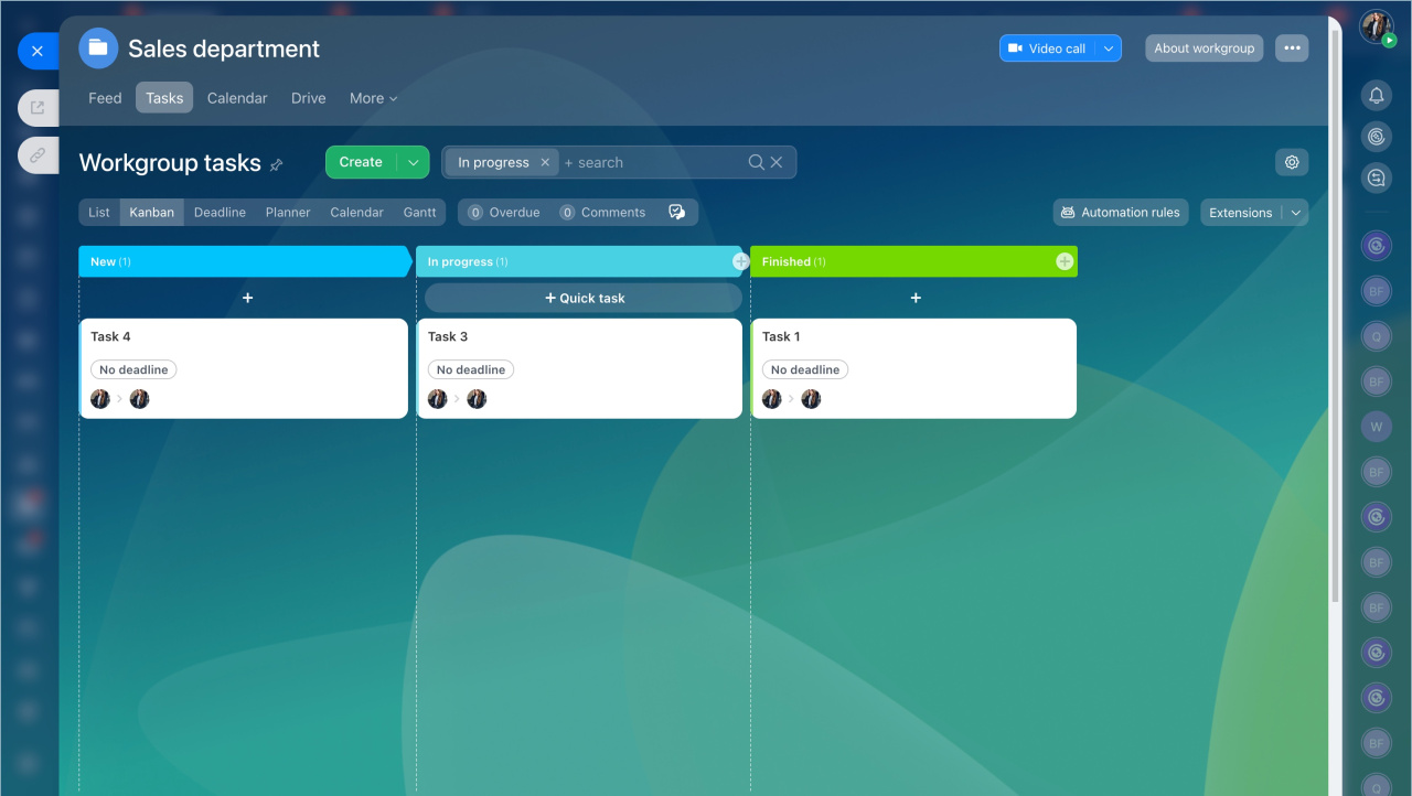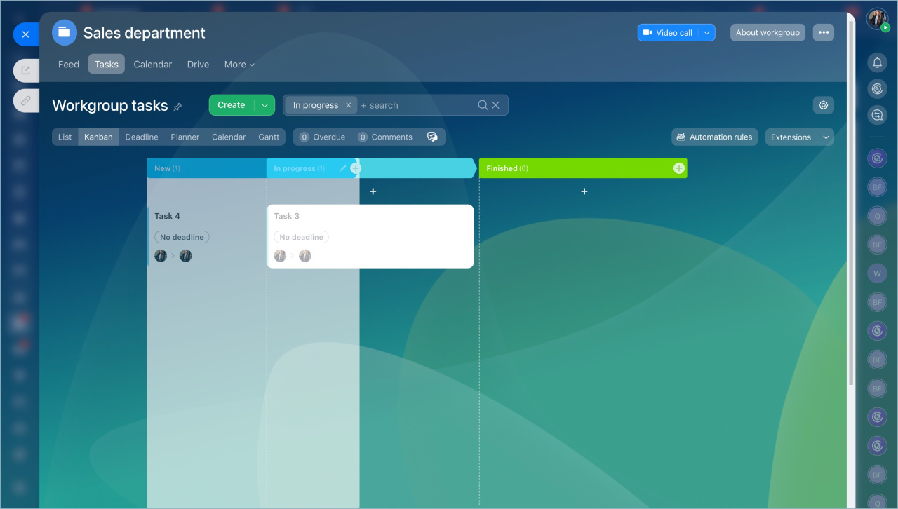 Pour commencer à travailler avec un tableau Kanban, accédez à un projet ou à un groupe de travail : Menu principal - Tâches et projets - Projets ou Menu principal - Groupes de travail.