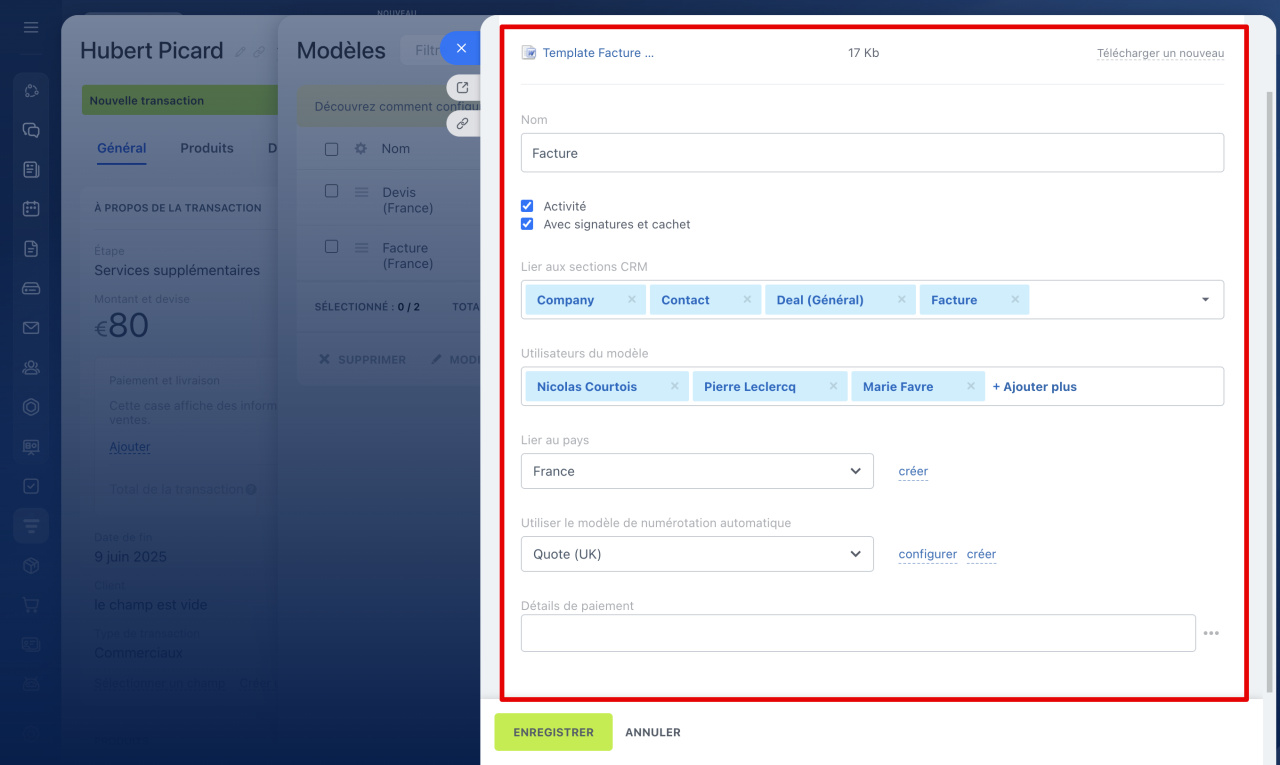 - Bitrix24 dispose d'un ensemble de modèles standard de documents. Vous pouvez configurer le modèle afin que les détails nécessaires soient automatiquement remplacés dans le modèle.