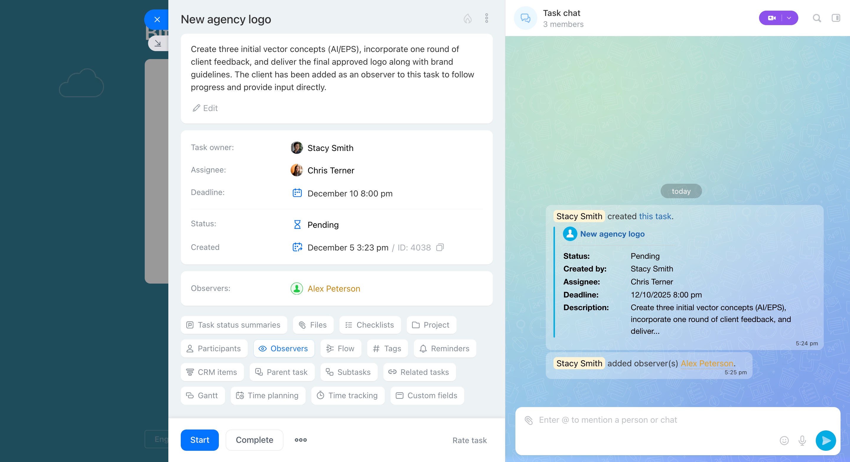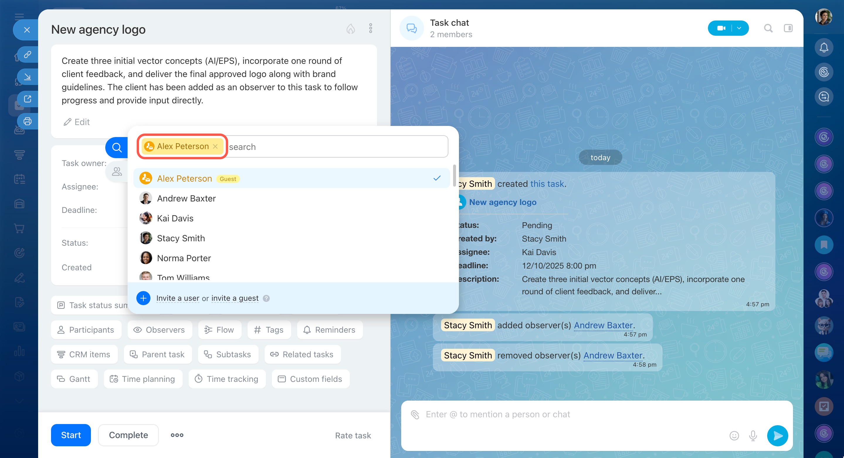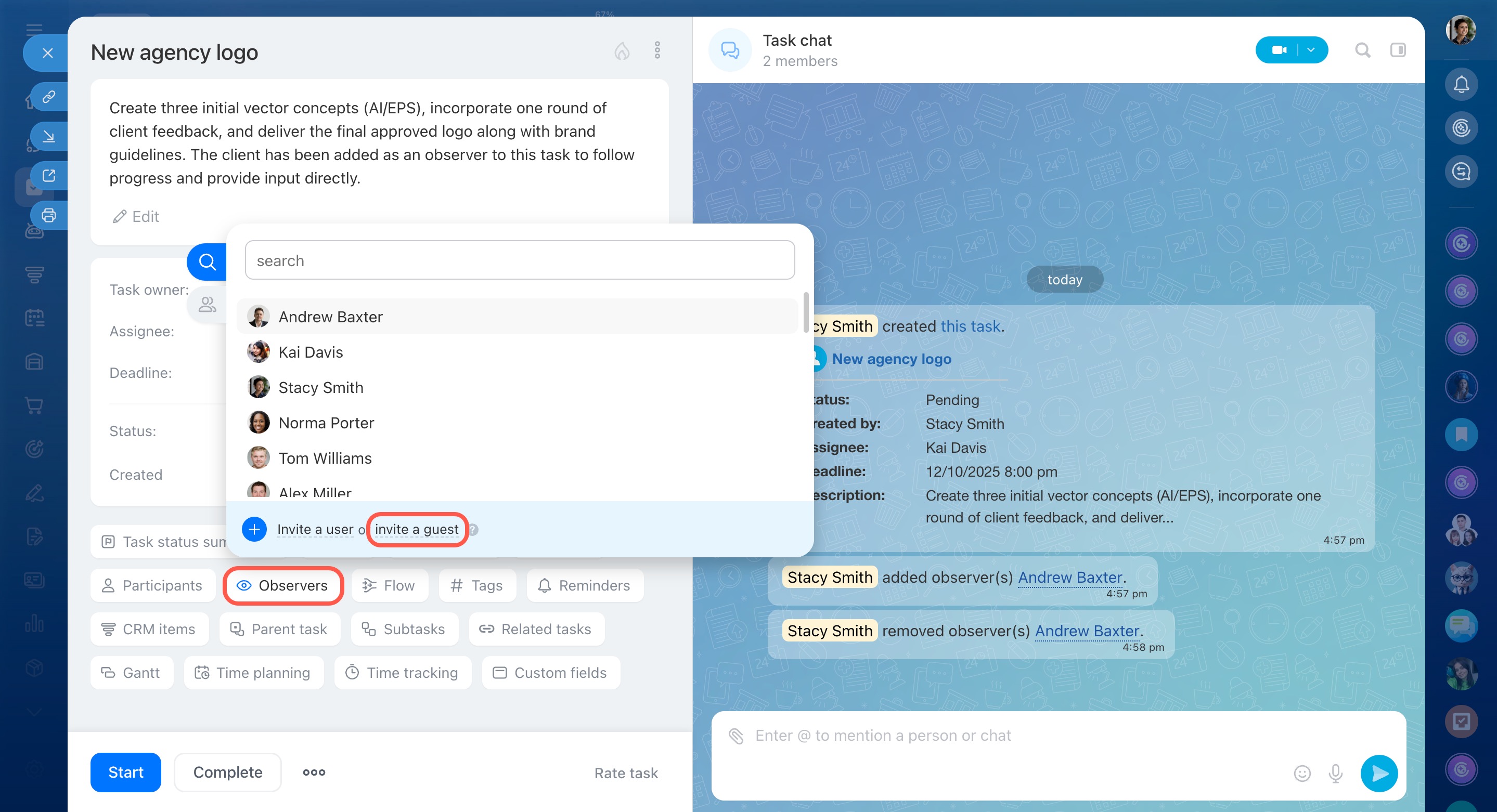 Parfois, pour travailler avec des tâches, vous devez joindre une personne qui ne travaille pas sur votre compte Bitrix24 : clients, partenaires ou indépendants. Ce sont des utilisateurs externes qui doivent être mis au courant de la tâche, tout en limitant leur accès à d'autres informations de l'entreprise.